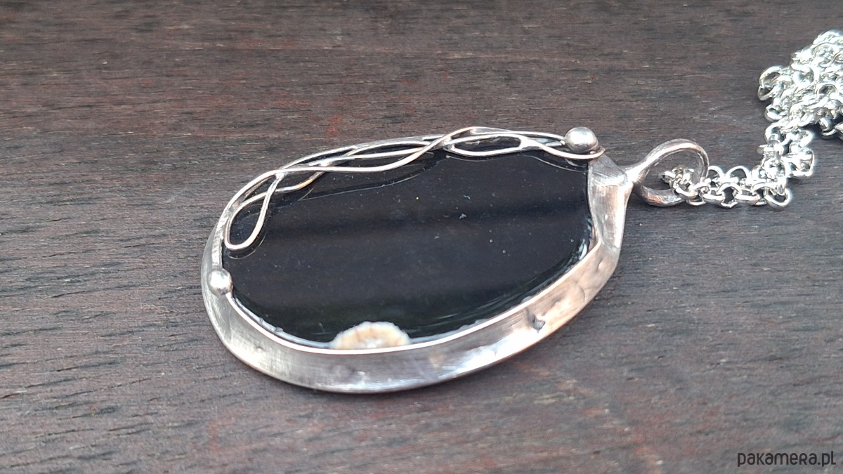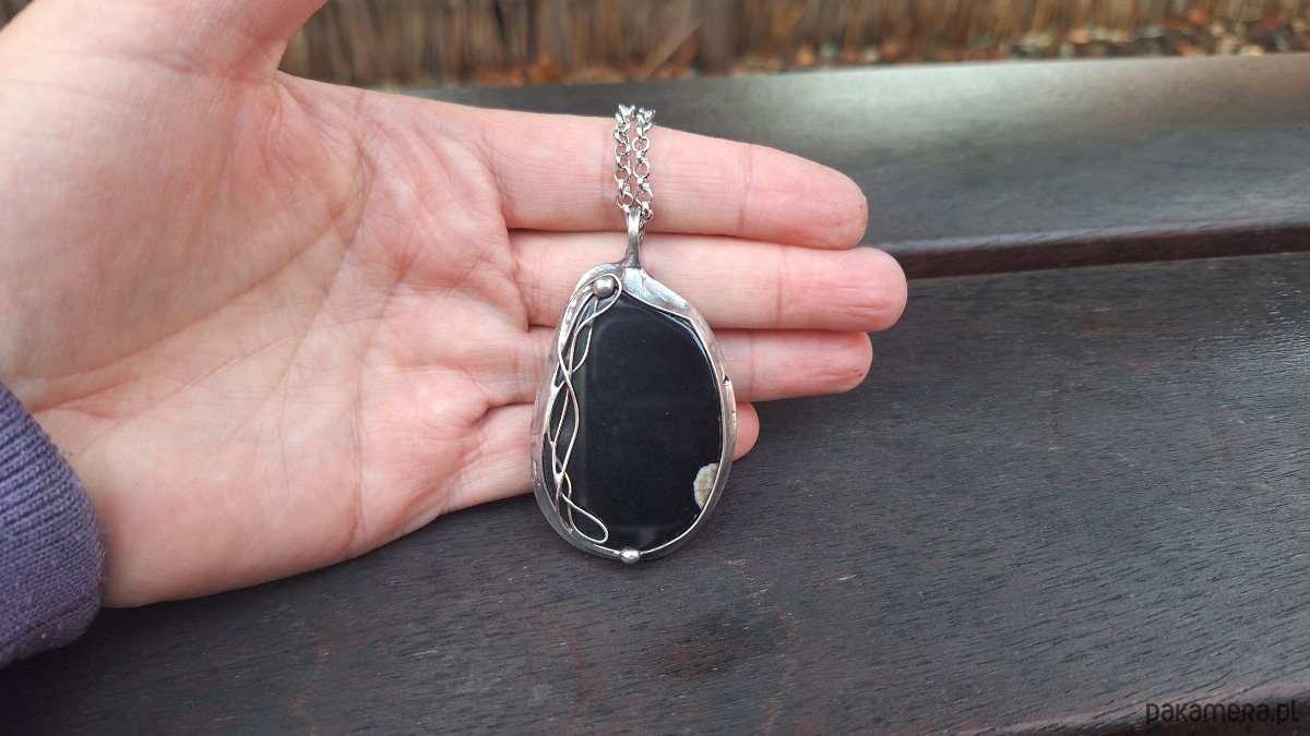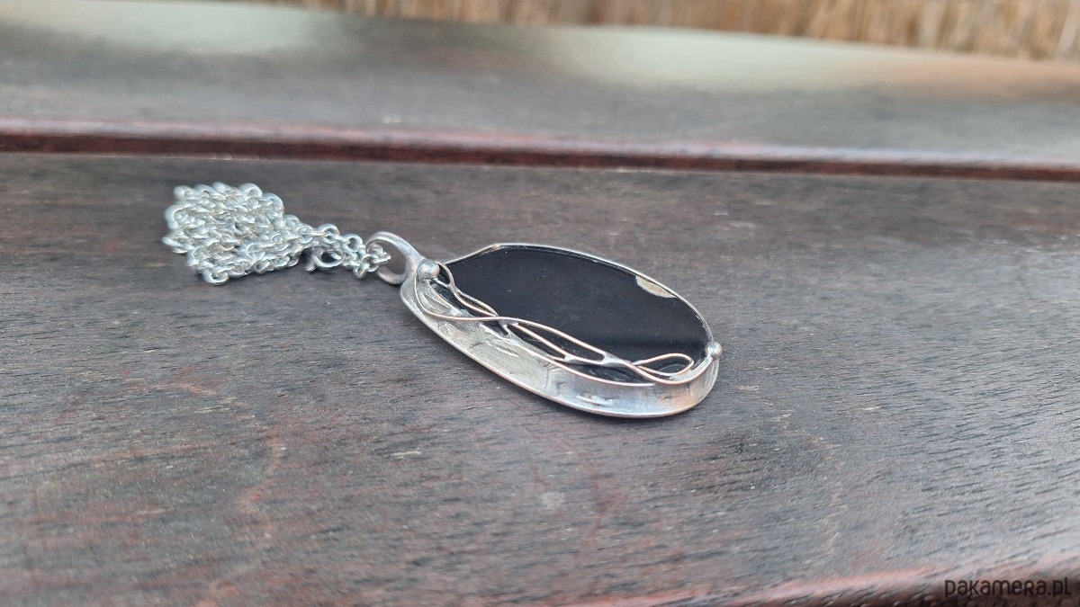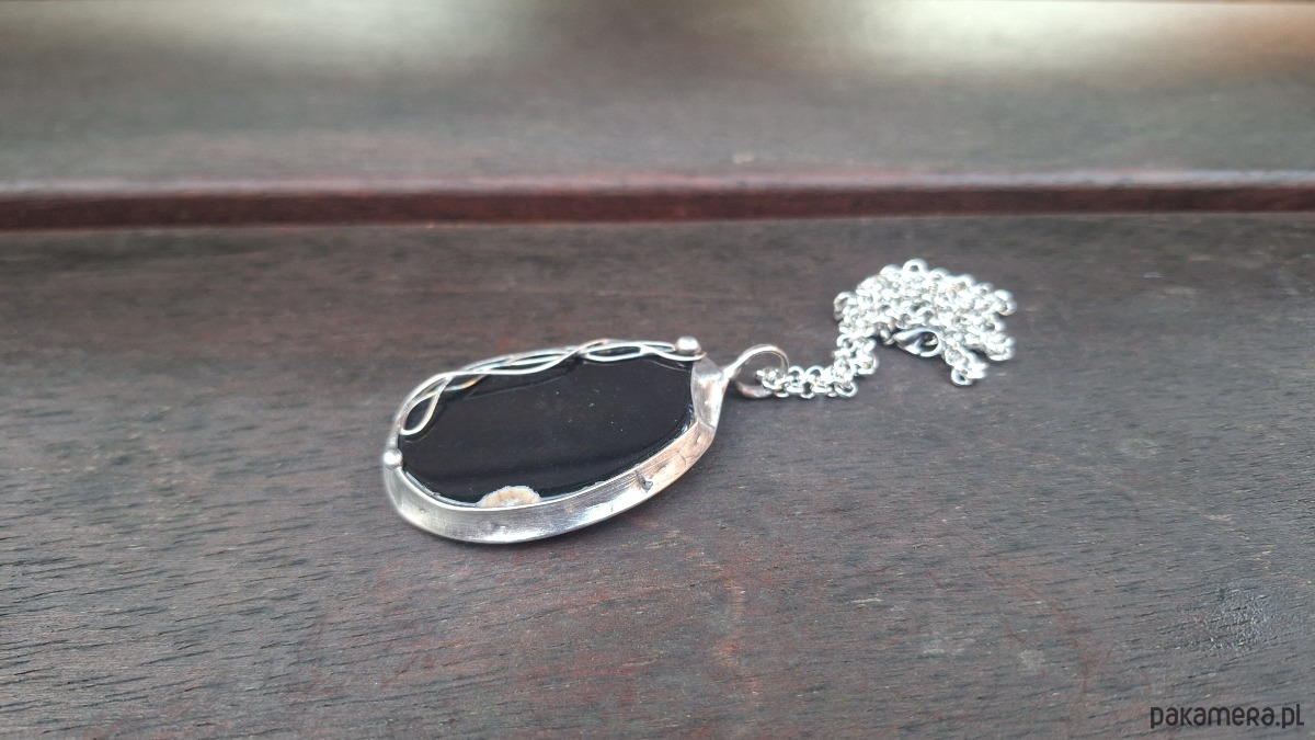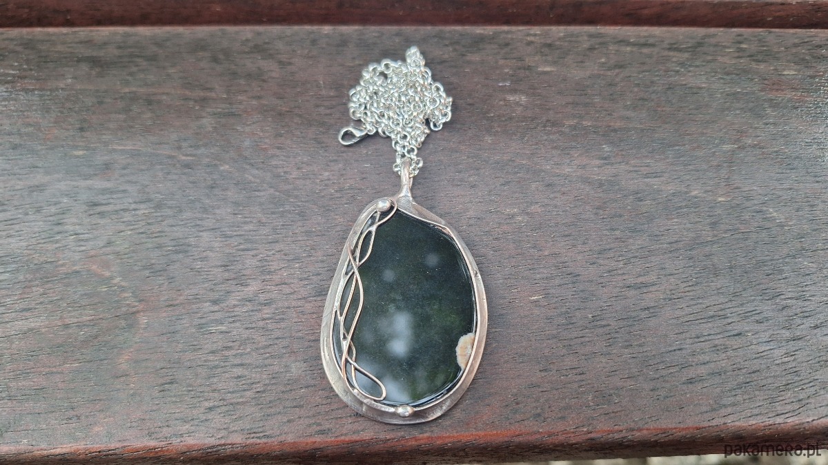 Wisiorek wykonany z miedzi, cyny i agatu. Wymiary ok. 5 na 3.5 cm. Zawieszony na łańcuszku o długości ok. 50 cm.