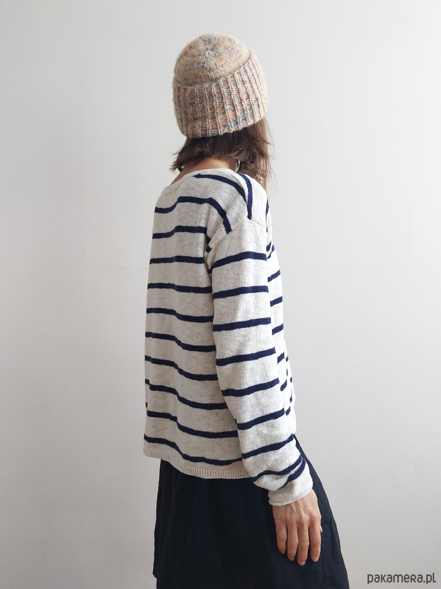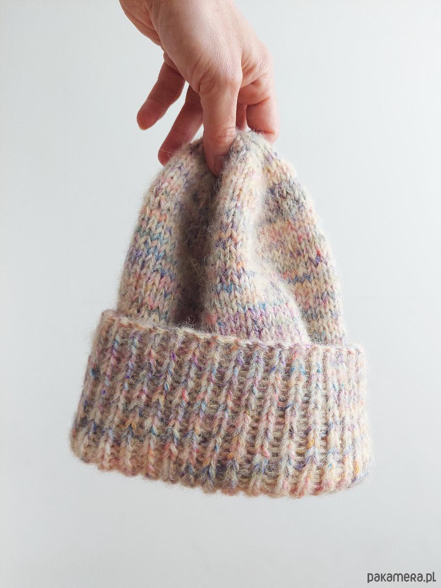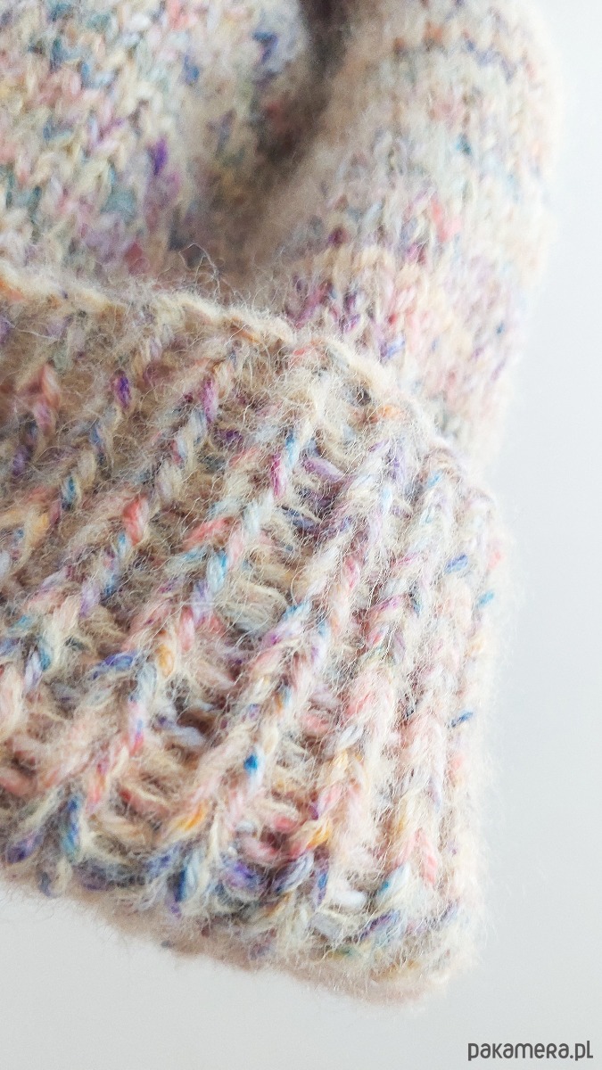 Czapka "HA_04" jest lekka, cudownie ciepła, wykonana ręcznie na drutach z wełny alpaki i jedwabiu morwowego (jedwab- cruelty free - pozyskiwany ze zbieranych, pustych kokonów jedwabnika morwowego) (Drops brushed Alpaca Silk + Drops Fiesta skarpetkowa - superwash klasa 1) . Może być zakładana z pełnym odwinięciem (w stylu fisherman beanie), z lekkim odwinięciem lub zupełnie bez odwinięcia.