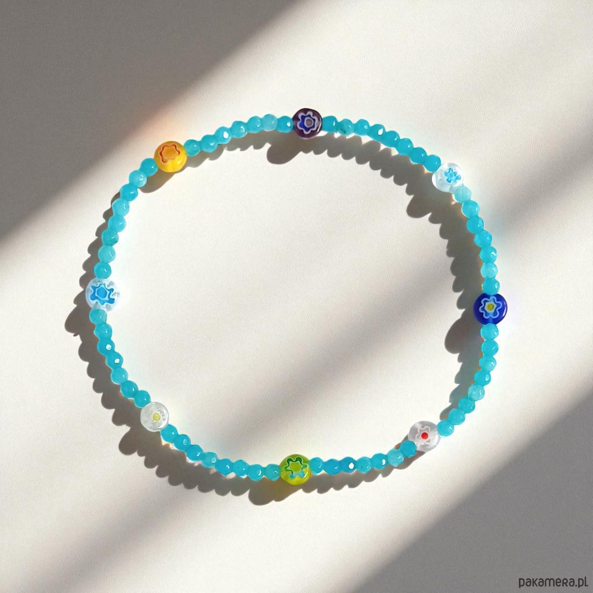 Cudna bransoletka NA KOSTKĘ na solidnej lince elastycznej, wykonana z turkusowego jadeitu (fasetowane kule 3mm), 8 szklanych kwiatuszków millefiori (ok.4-5mm)