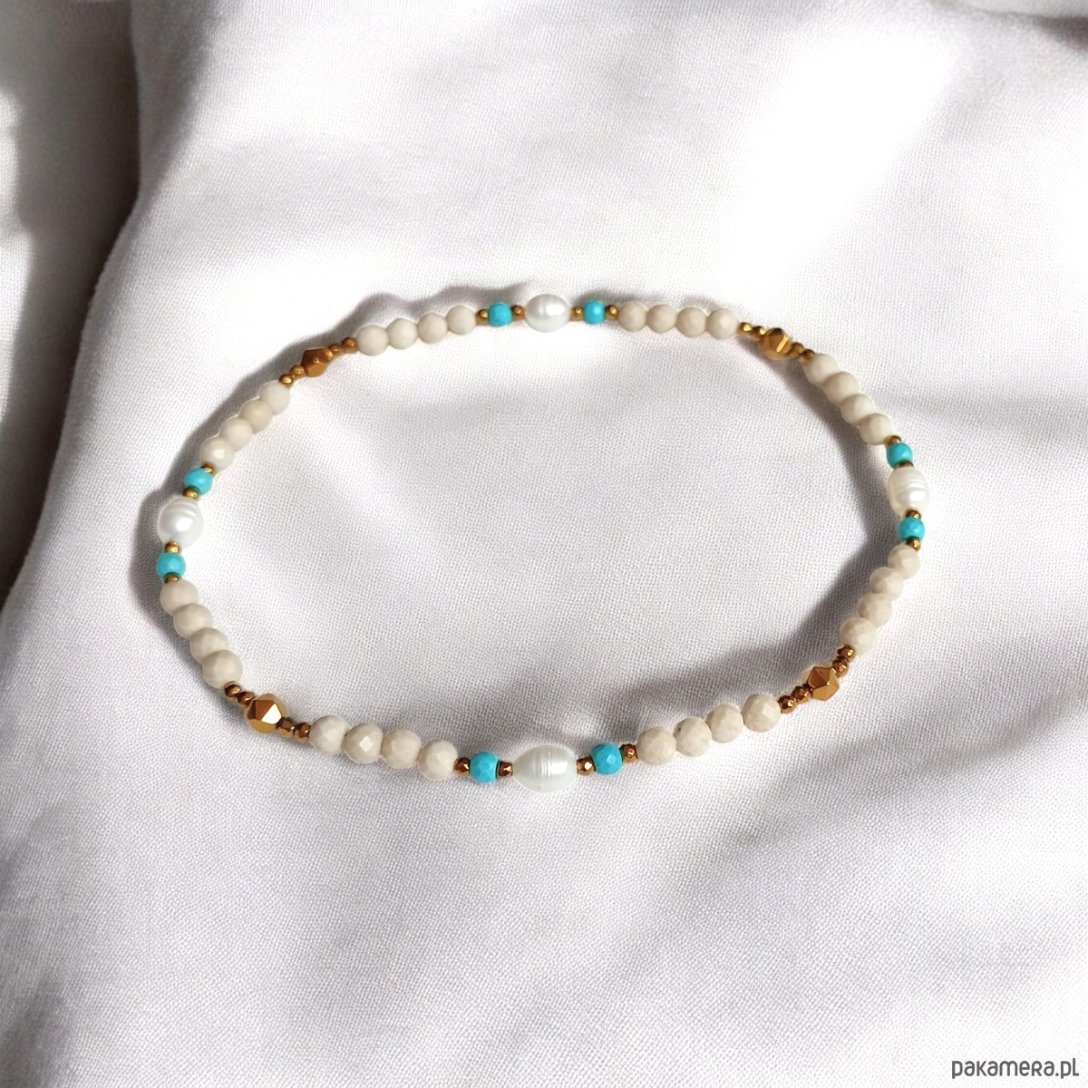 Cudna bransoletka NA KOSTKĘ na solidnej lince elastycznej, wykonana z kamienia rzecznego (fasetowane kule 4mm), pereł słodkowodnych, fasetowanego magnezytu, fasetowanego hematytu.