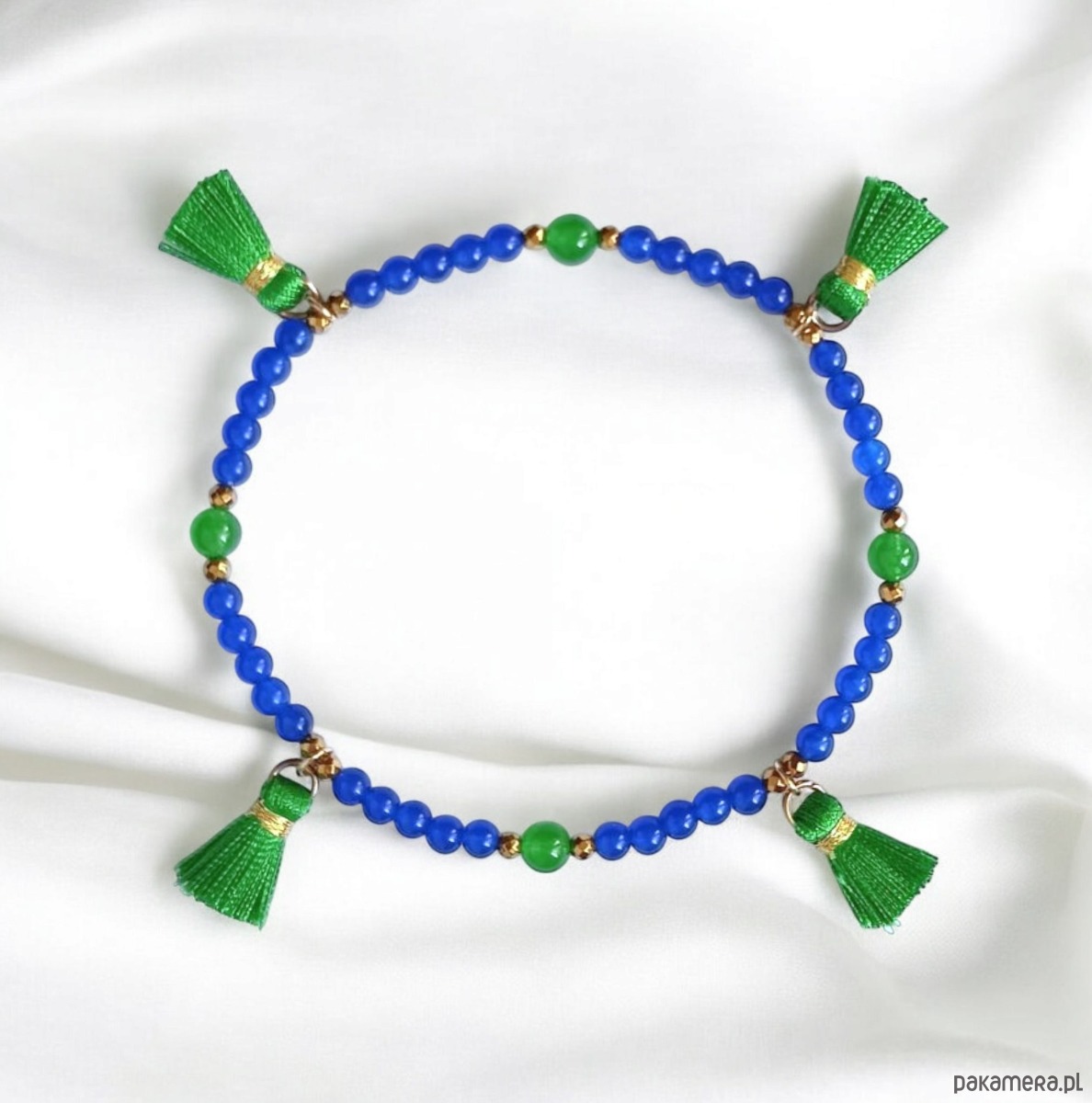 Urocza i niepoważna bransoletka NA KOSTKĘ na solidnej lince elastycznej, wykonana z jadeitu w soczystych kolorach (4 i 6mm) oraz fasetowanego złotego hematytu 3mm i ozdobnych chwostów (ok. 20mm).