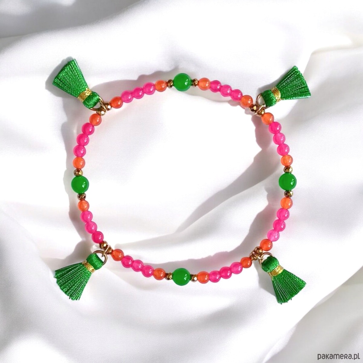 Urocza i niepoważna bransoletka NA KOSTKĘ na solidnej lince elastycznej, wykonana z jadeitu w soczystych kolorach (4 i 6mm) oraz fasetowanego złotego hematytu 3mm i ozdobnych chwostów (ok. 20mm).