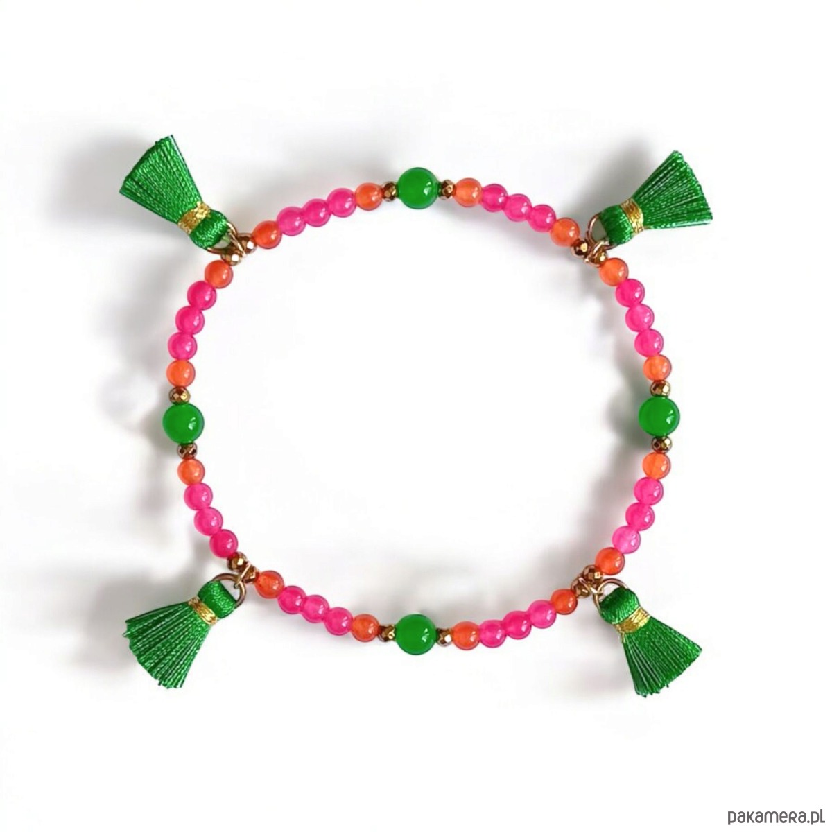 Urocza i niepoważna bransoletka NA KOSTKĘ na solidnej lince elastycznej, wykonana z jadeitu w soczystych kolorach (4 i 6mm) oraz fasetowanego złotego hematytu 3mm i ozdobnych chwostów (ok. 20mm).