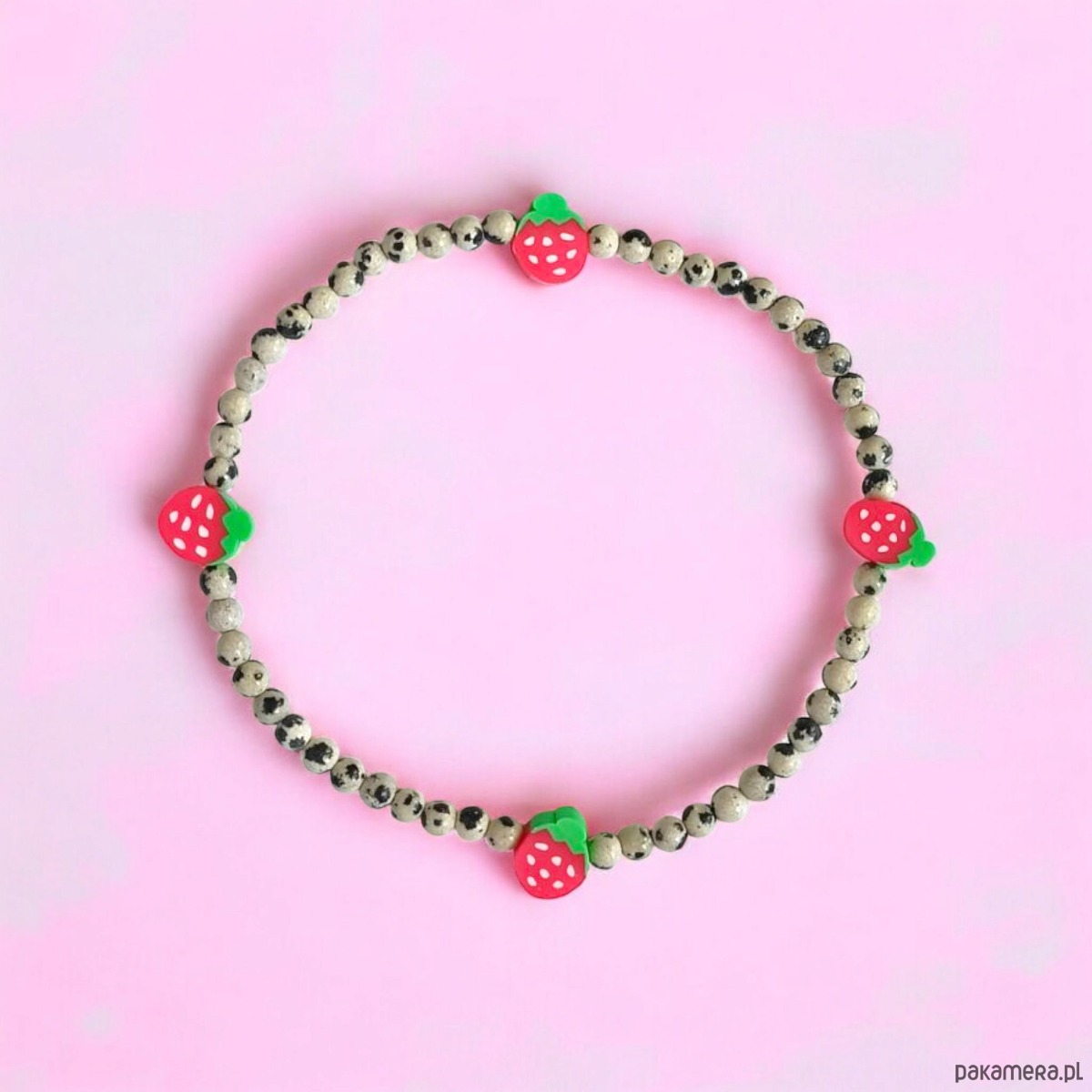 Urocza i niepoważna bransoletka NA KOSTKĘ na solidnej lince elastycznej, wykonana z jaspisu dalmatyńskiego (ok. 4mm) oraz truskawek z modeliny fimo.