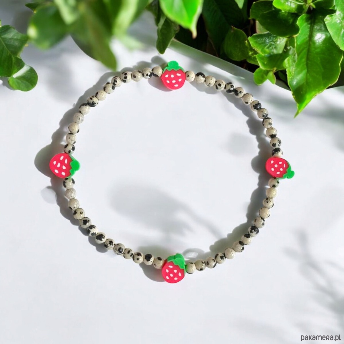 Urocza i niepoważna bransoletka NA KOSTKĘ na solidnej lince elastycznej, wykonana z jaspisu dalmatyńskiego (ok. 4mm) oraz truskawek z modeliny fimo.