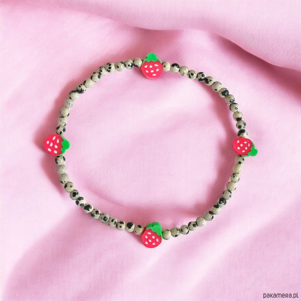 Urocza i niepoważna bransoletka NA KOSTKĘ na solidnej lince elastycznej, wykonana z jaspisu dalmatyńskiego (ok. 4mm) oraz truskawek z modeliny fimo.