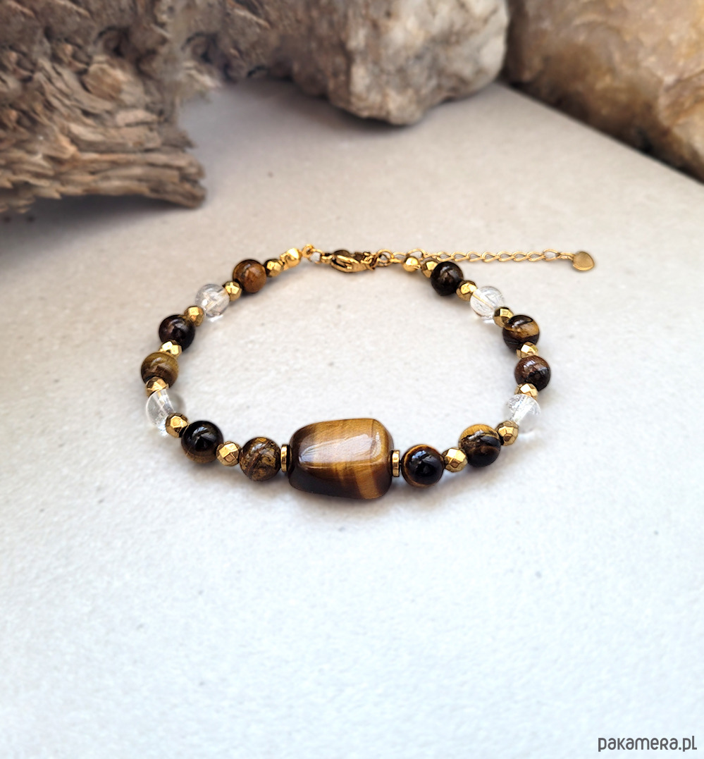 JEDYNA SZTUKA- Przepiękna elegancka bransoletka zrobiona z kamieni naturalnych: Tygrysiego oka, Kryształu górskiego oraz Hematytu w kolorze złota.
