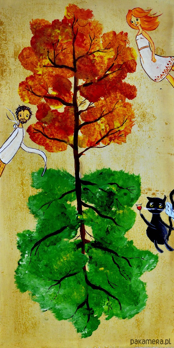 "Na Patriarszych Prudach" - akryle i kolaż na płótnie. Wystawiony przedmiot to wydruk na płótnie naciągniętym na drewnianą ramę, gotowy do powieszenia na ścianę. 30x60 cm.