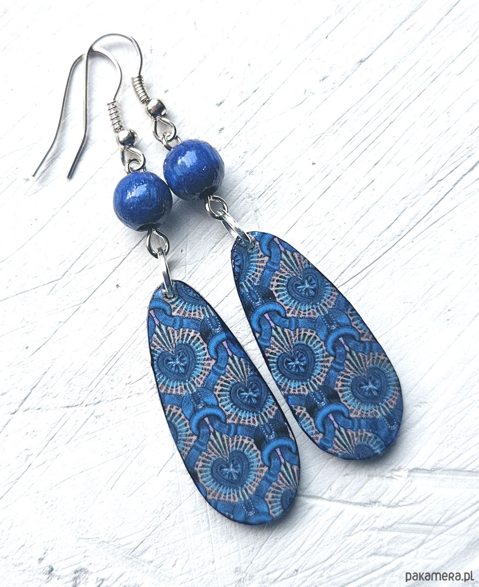 kolczyki drewniane, ozdobione metodą decoupage, dwustronne, starannie wykończone farbami akrylowymi i zabezpieczone wielokrotnie lakierem, koraliki drewniane, bigle posrebrzane, długość kolczyków bez bigli: 5 cm, szerokość: 1,5 cm, bardzo lekkie