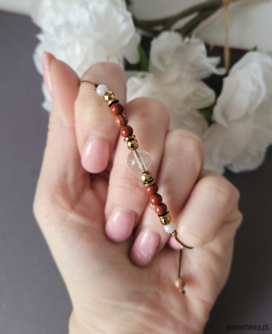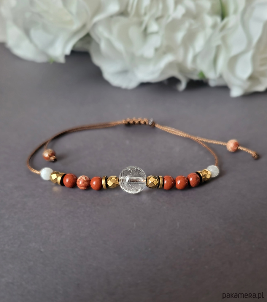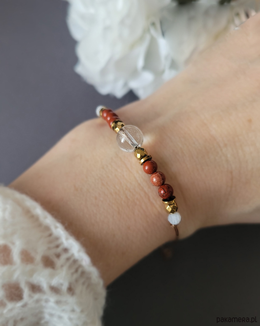 Piękna delikatna bransoletka na przemęczenie zrobiona z kamieni naturalnych: Kamienia księżycowego, Kryształu górskiego, Jaspisu czerwonego oraz Hematytu w kolorze złota.
