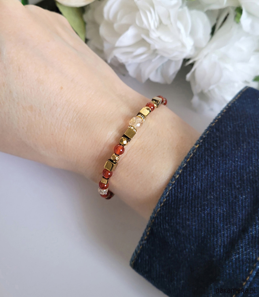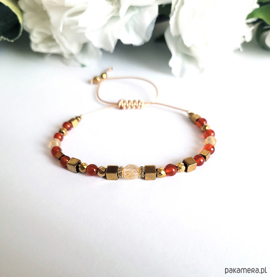 Piękna delikatna bransoletka na przemęczenie zrobiona z kamieni naturalnych: Cytrynu, Agatu Karneolowego oraz Hematytu w kolorze złota.