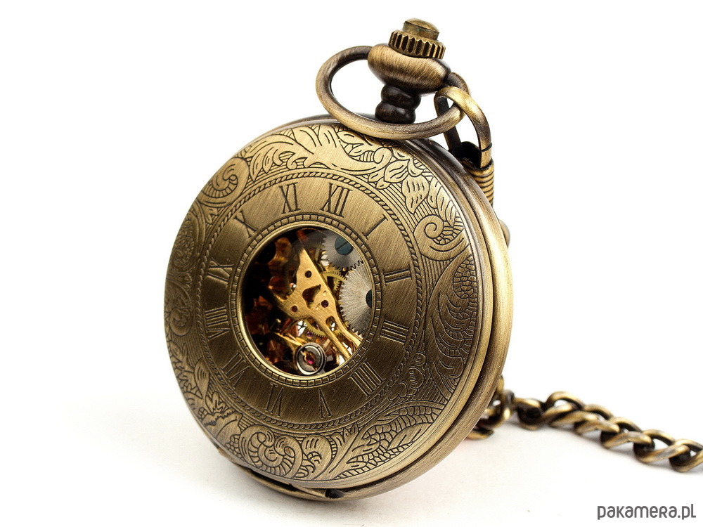 Bardzo klasyczny, a zarazem niecodzienny wzór. Zabytkowy styl dla Panów doceniających oryginalność i styl. Wyjątkowy egzemplarz, który otwiera się z jednej i z drugiej strony. Po otwarciu pierwszej strony widoczna jest tarcza zegarka wraz z mechanizmem dziania. Z tyłu natomiast w całej okazałości można podziwiać działanie trybików przeskakujących w zegarku. Na przedniej i tylnej ściance zegarka znajduje się ciekawe wzornictwo wraz z oznaczeniem godzin cyframi rzymskimi, zatem można sprawdzić czas bez jego otwierania. Ręcznie nakręcany zegarek mechaniczny, nie wymaga baterii. Zegarek otwierany automatycznie poprzez przycisk znajdujący się przy mechanizmie do nakręcania. Dzięki łańcuszkowi zegarek pełni funkcję zegarka kieszonkowego.