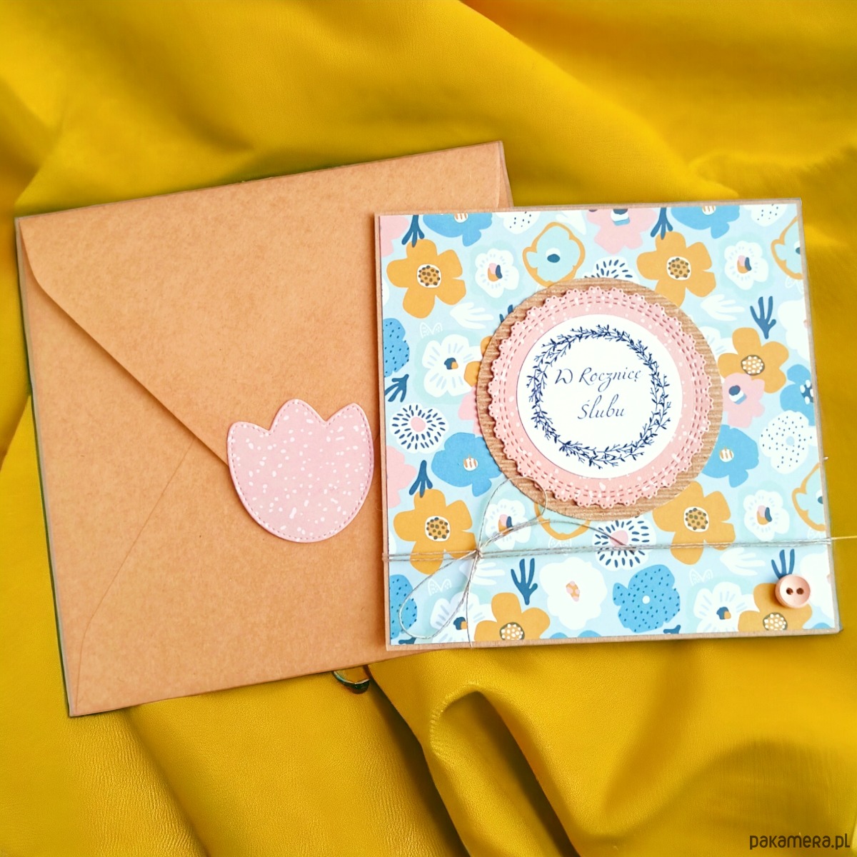 - wykonana na bazie grubego kartonu EKO-kraft (100% makulatury), ozdobiona wzorzystym kartonem oraz elementem przestrzennym z drukowanym napisem i drewnianym guziczkiem. przewiązana sznurkiem jutowym. konstrukcja lekko przestrzenna.