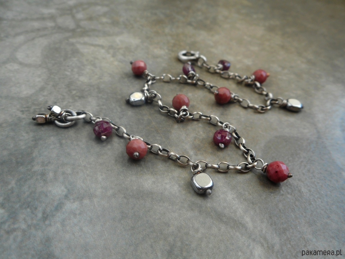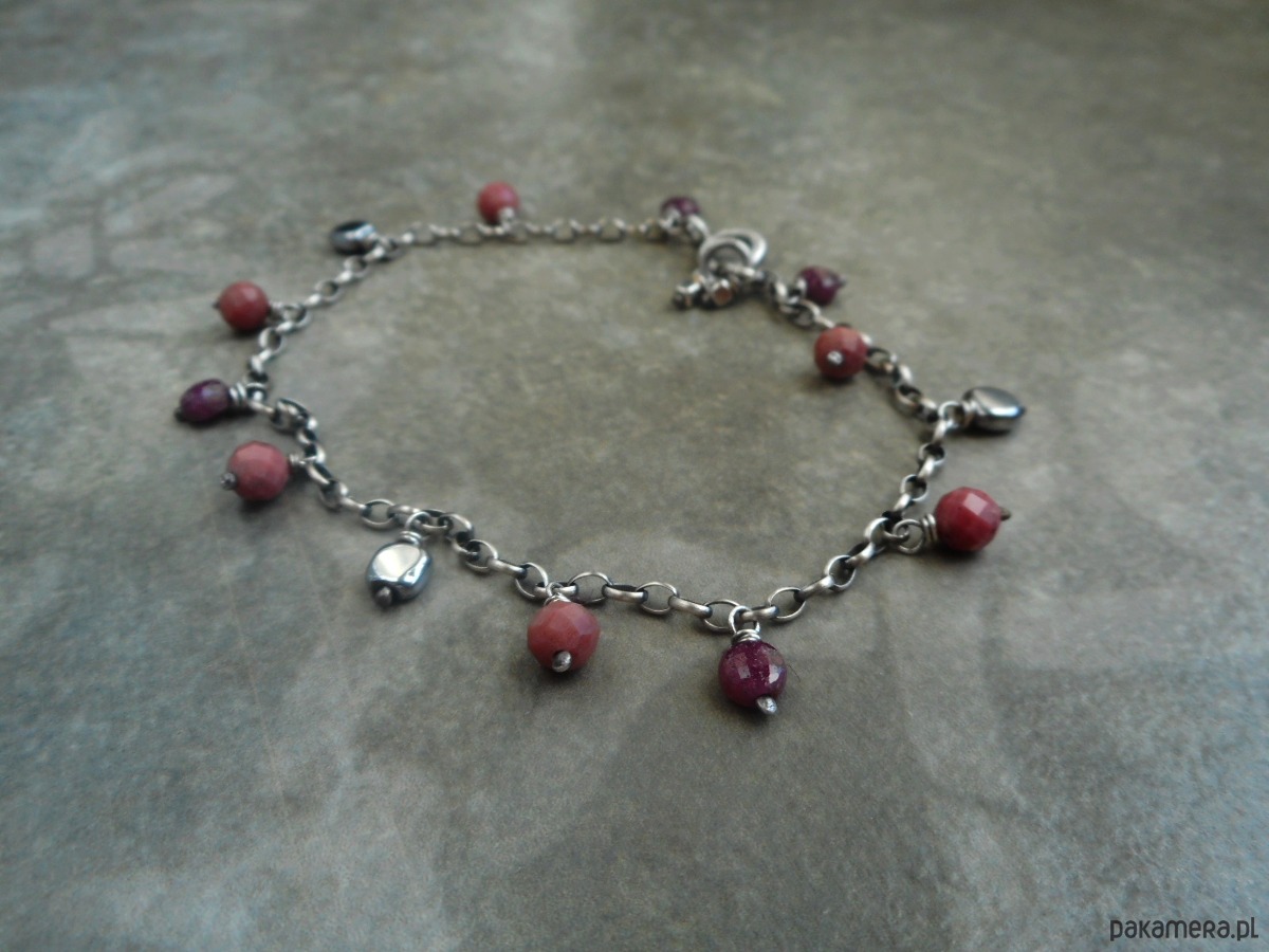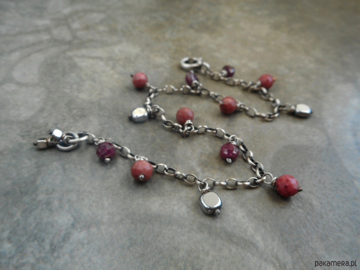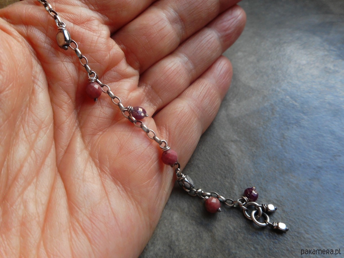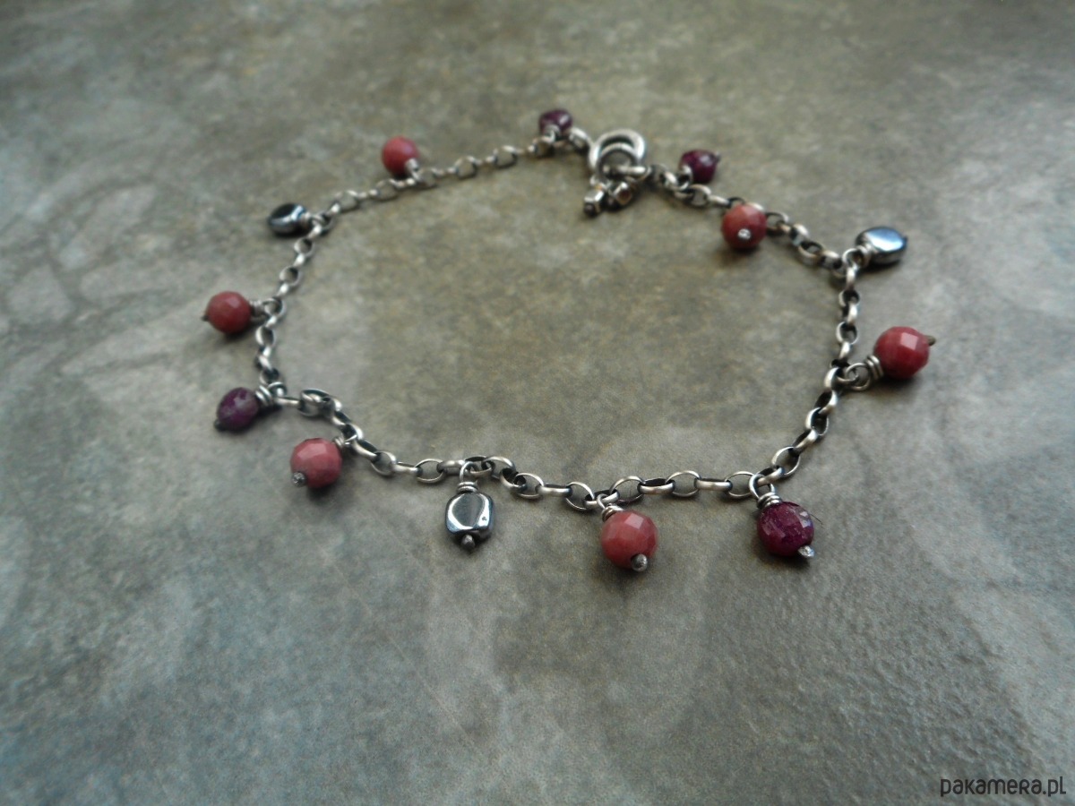 Delikatna bransoletka z zawieszkami, wykonana z kamieni naturalnych i szlachetnego srebra; lekka, łańcuszkowa, ozdobionych szeregiem drobnych, różnorodnych kamyków.