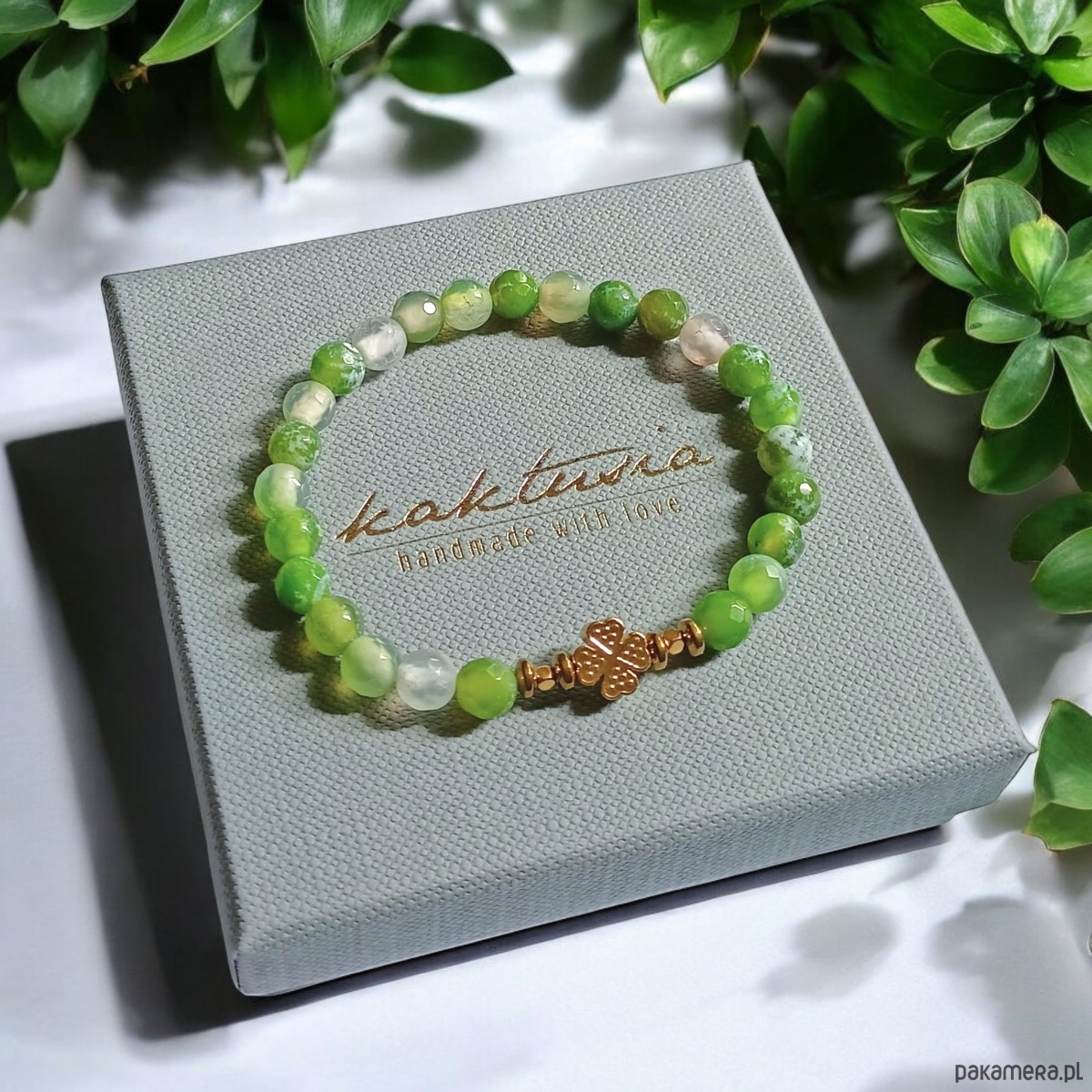 śliczna bransoletka na solidnej lince elastycznej, wykonana z fasetowanego, zielono-białego agatu 6mm oraz przekładek i koniczynki ze złotego hematytu.