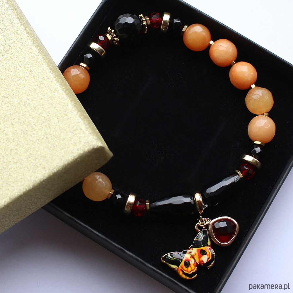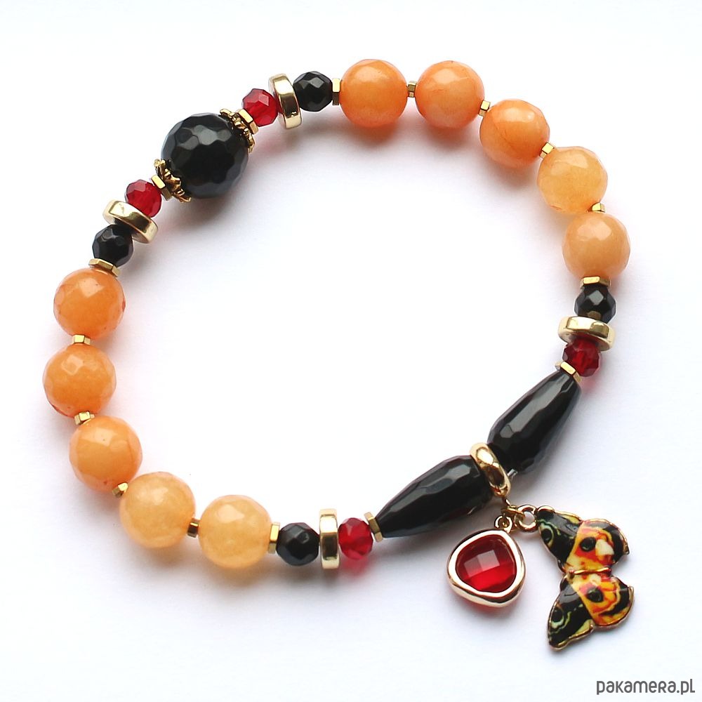 Unikatowa, elegancka bransoletka energetyczna z fasetowanym agatem ognistym, onyksem, czarnym turmalinem, rubinem i hematytem. Soczysta, kobieca, ozdobiona piękną emaliowaną zawieszką z motylem.