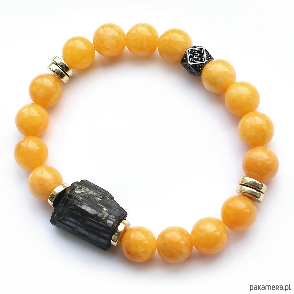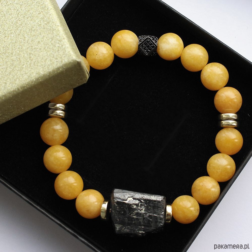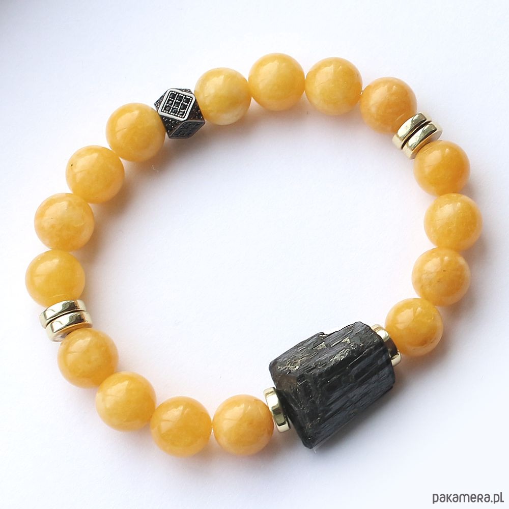Unikatowa, elegancka bransoletka energetyczna z bryłą surowego turmalinu, żółtym jadeitem i hematytem. Żółty Jadeit dodaje optymizmu i pewności siebie, wspiera pozytywną postawę życiową i nastawienie na sukces. Przypomina o stałej łączności ze Źródłem Wszelkiej Obfitości i Pomyślności. Wspomaga poczucie celu, pozytywną motywację do działania i wiarę w zwycięstwo.