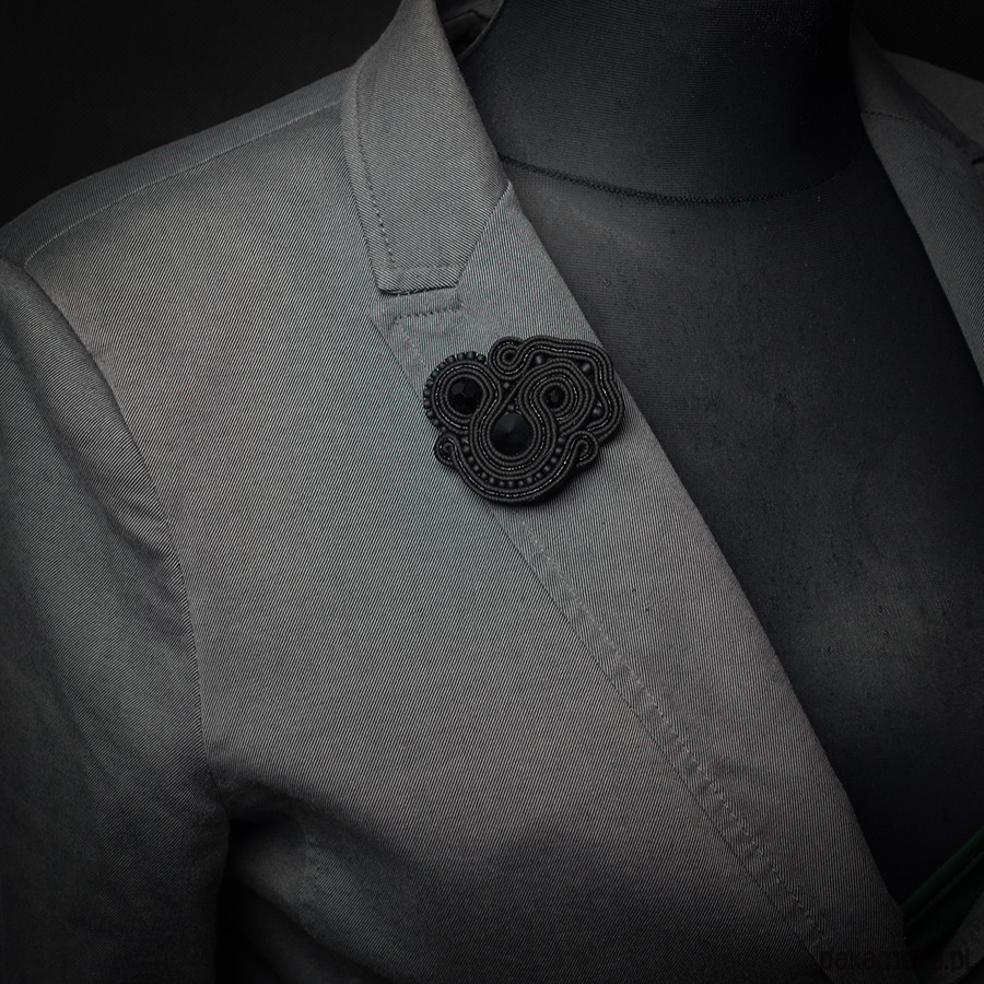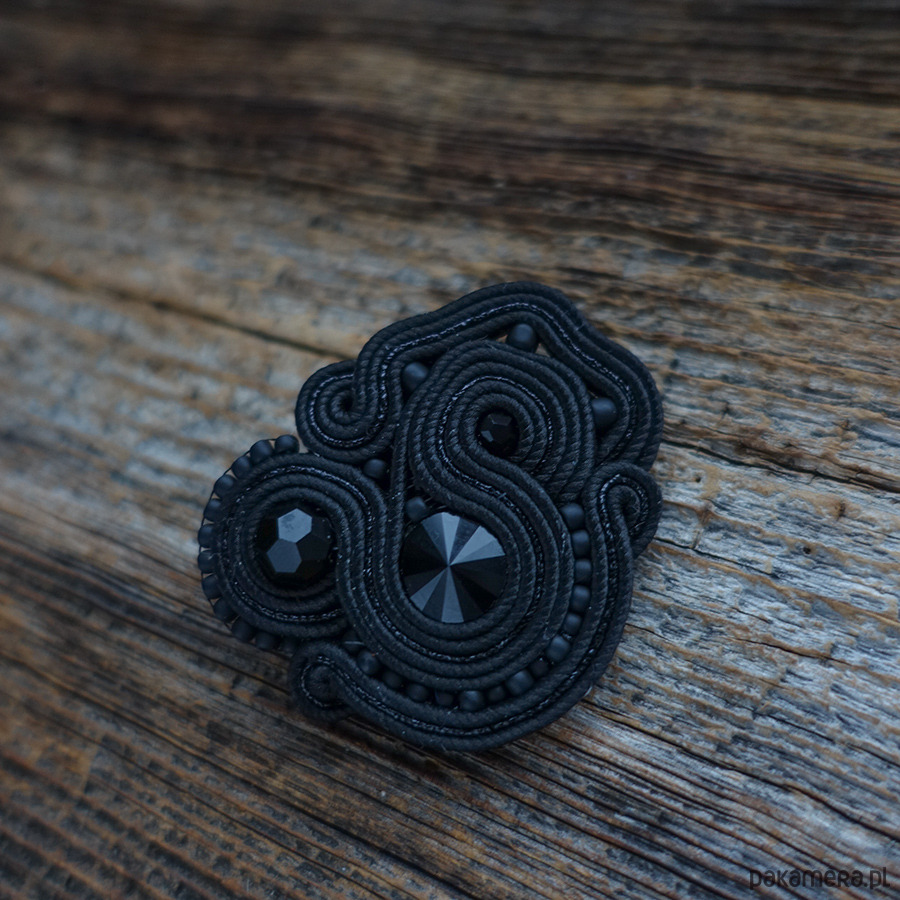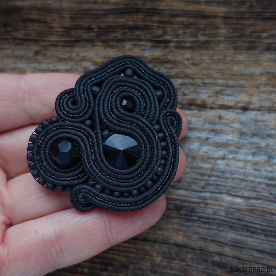 Ręcznie wykonana broszka w technice haftu soutache – w całości utrzymana w czerni, co nadaje jej niezwykłej elegancji i dramatycznego charakteru.