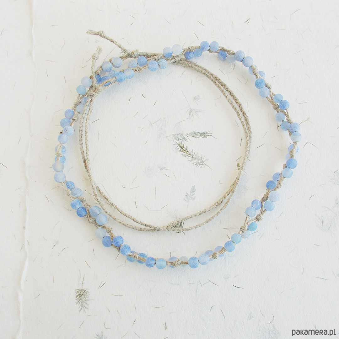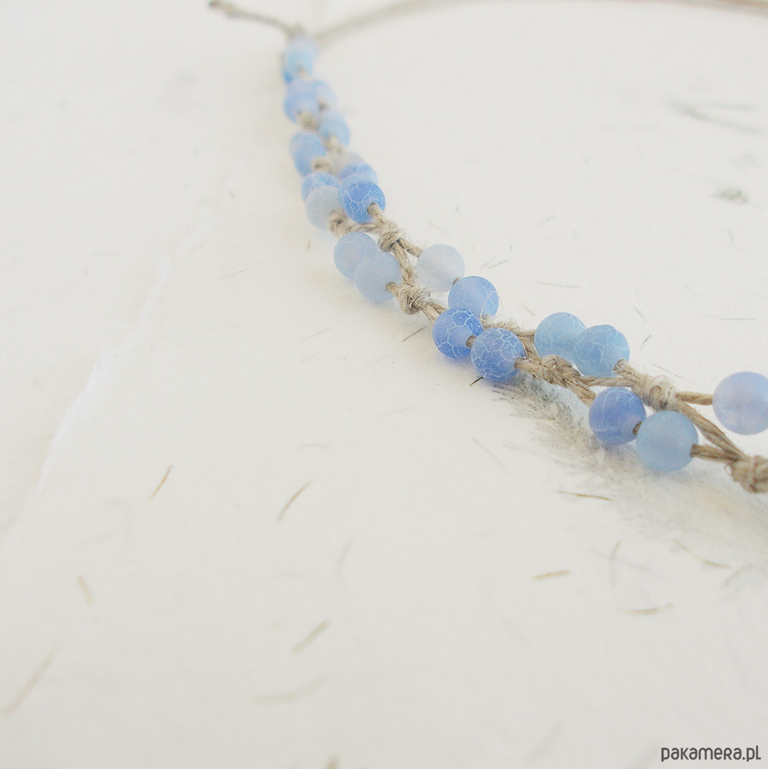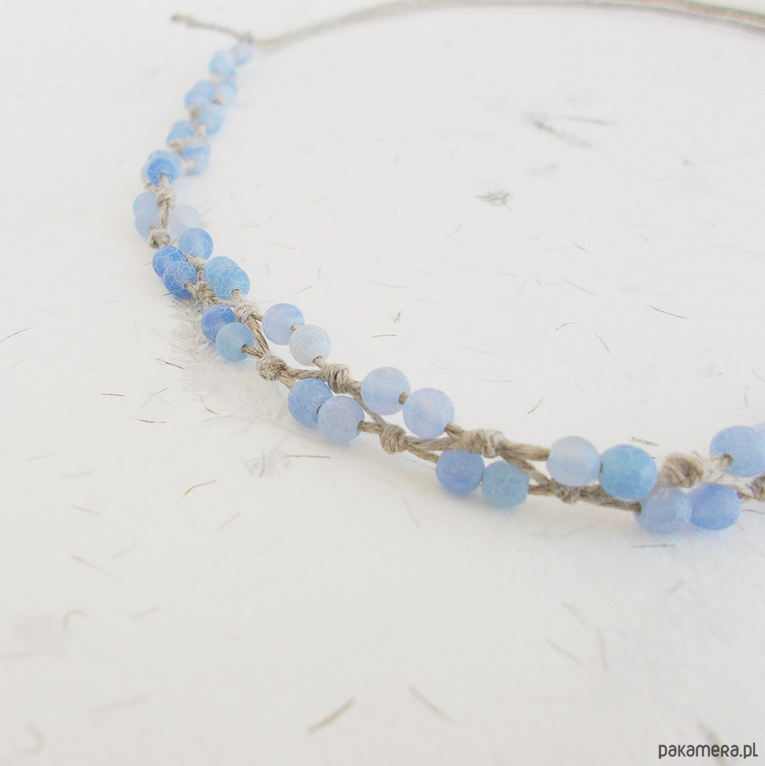 wykonany na bazie naturalnego lnu i niebieskiego agatu z charakterystycznymi żyłkami