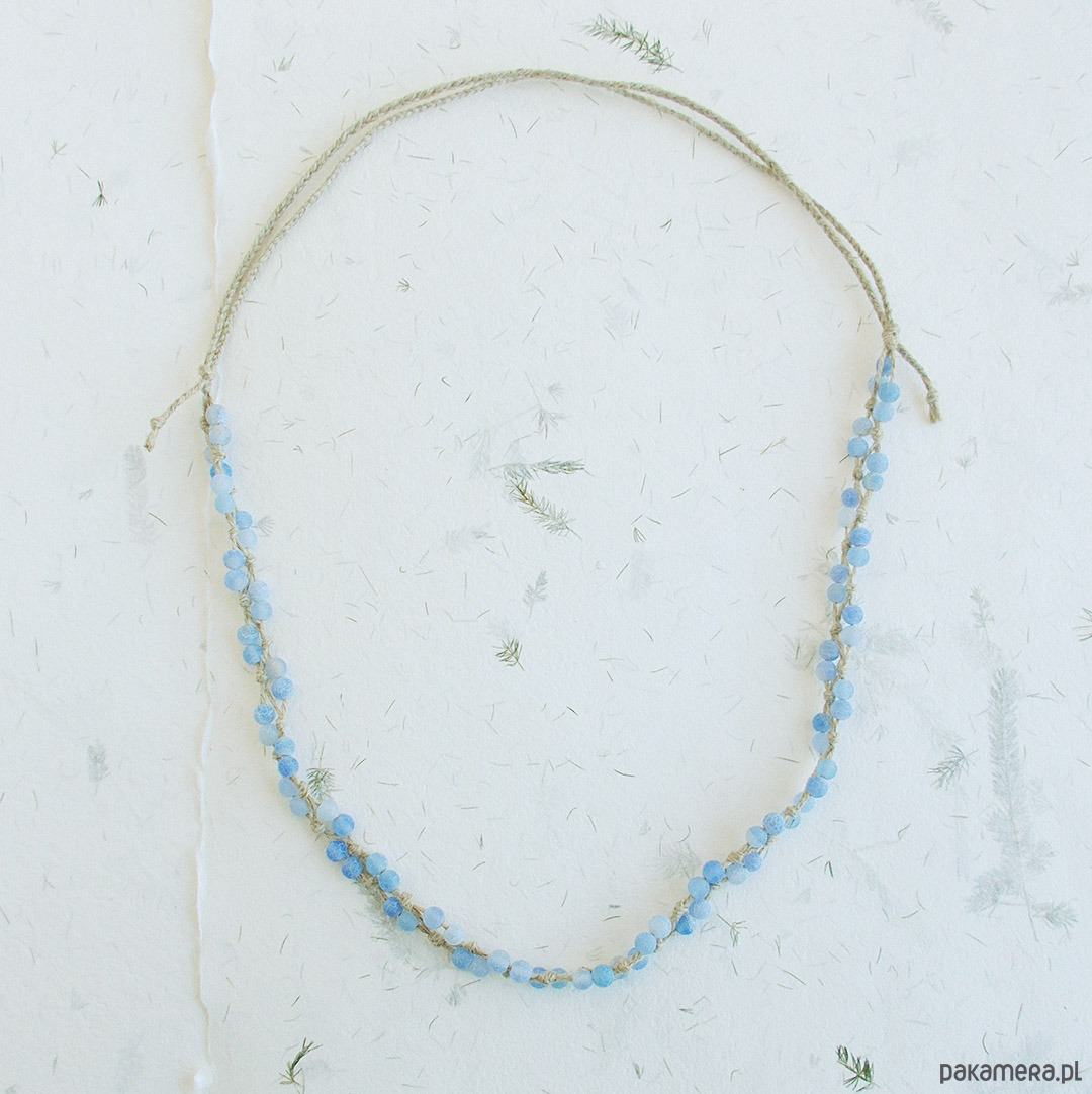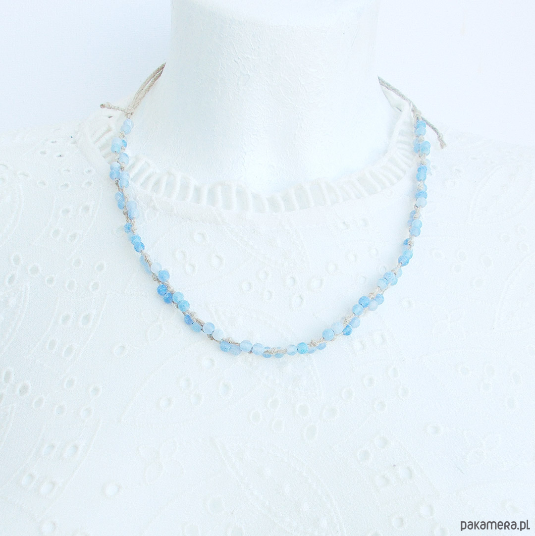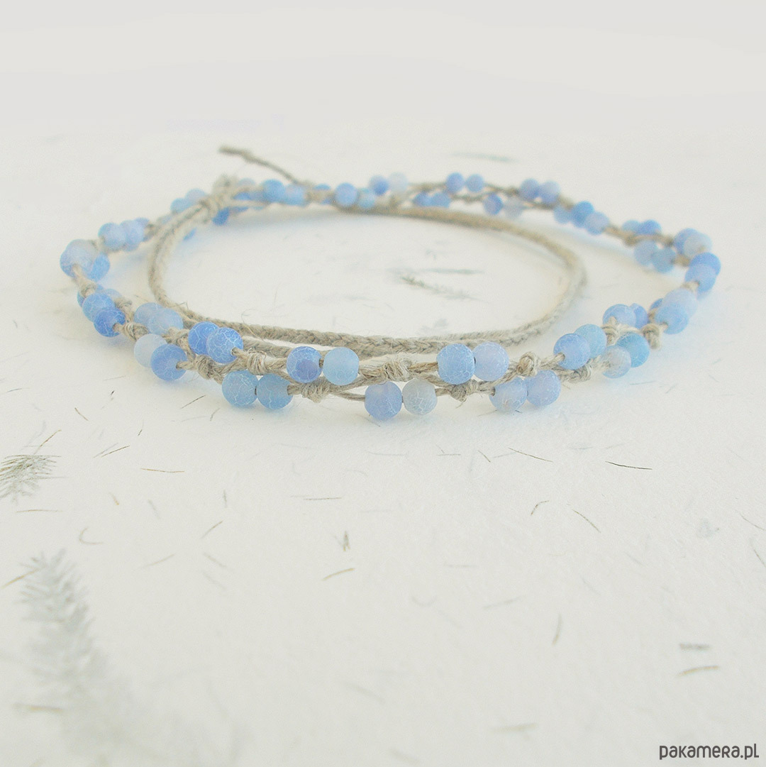 wykonany na bazie naturalnego lnu i niebieskiego agatu z charakterystycznymi żyłkami