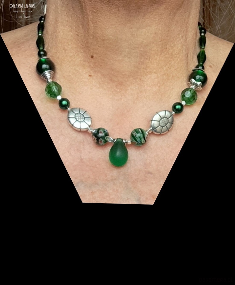 Moja niebanalna i efektowna kompozycja kompletu biżuterii: naszyjnika, bransoletki i kolczyków z niezwykle pięknego czeskiego szkła w obłędnej zieleni i elementów posrebrzanych oraz szkła weneckiego i kryształów. Efektowny i ciekawy zestaw, znakomity dla osoby kochającej styl boho i szalone kolory. Naszyjnik ok. 45 cm + regulacja, bransoletka na elastycznym nośniku ok. 19 cm, kolczyki ok 5 cm.