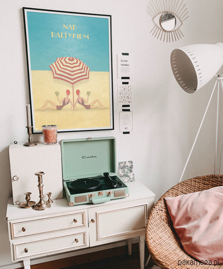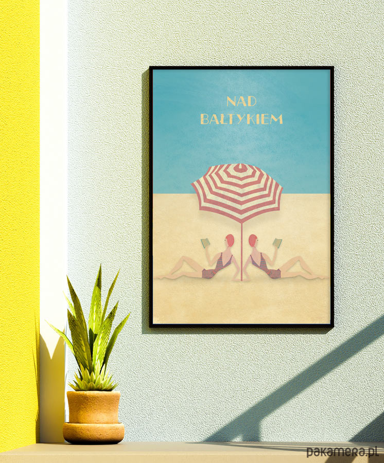 Plakat w stylu vintage przedstawiający słoneczną plażę nad Bałtykiem w letni dzień. Dwie bliźniacze plażowiczki w kostiumach retro czytają książkę ukryte pod parasolem w paski. W oddali widać spokojne Morze Bałtyckie. Inspirowany plakatami podróżniczymi z lat 20-tych XX wieku.