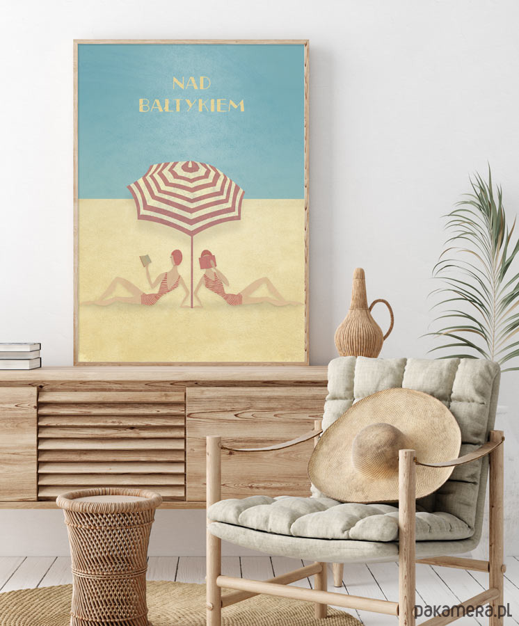 Plakat w stylu vintage przedstawiający słoneczną plażę nad Bałtykiem w letni dzień. Dwie bliźniacze plażowiczki w kostiumach retro czytają książkę ukryte pod parasolem w paski. W oddali widać spokojne Morze Bałtyckie. Inspirowany plakatami podróżniczymi z lat 20-tych XX wieku.
