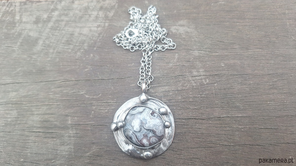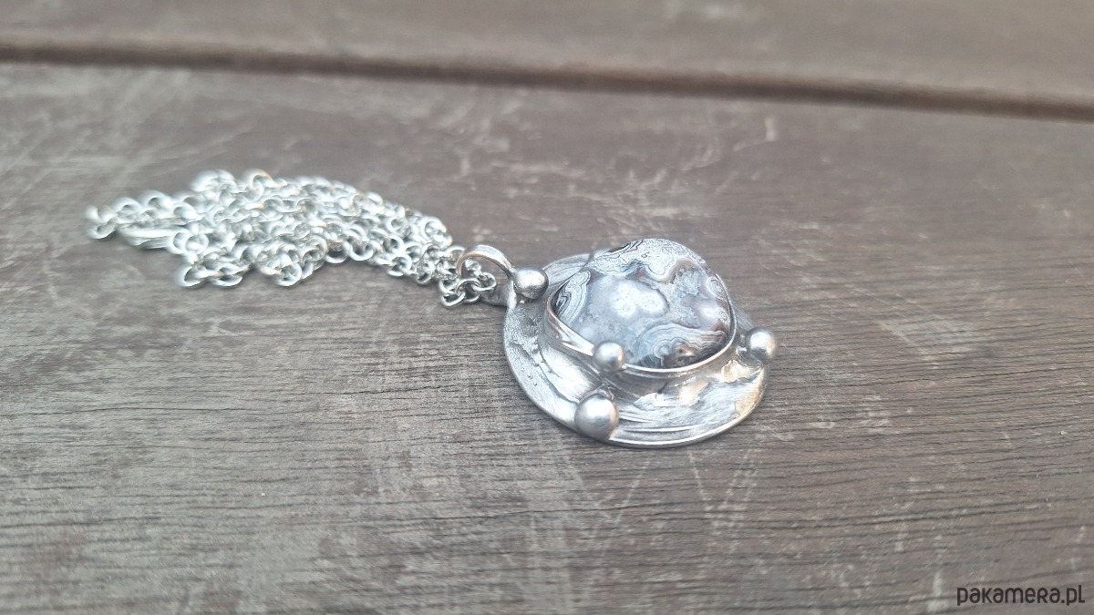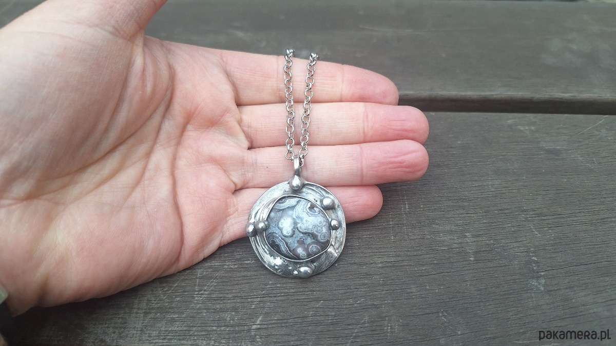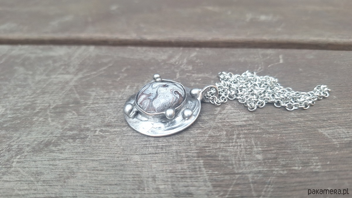 Wisiorek wykonany z miedzi, cyny i agatu. Wymiary ok. 3.3 na 3.3 cm. Zawieszony na łańcuszku o długości ok. 50 cm.