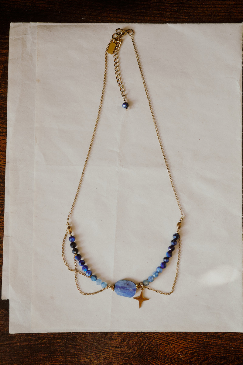 Krótki naszyjnik inspirowany nocnym niebem, kolorem indygo i gwiazdami spełniającymi życzenia. Kyanit układany jest gradientowo od jasnego po ciemny, niektóre kamyczki pięknie iryzują. W centrum znajduje się większa bryłka kyaniutu ozdobiona gwiazdką i niesymetryczną falbanką z pozłacanego łańcuszka. Długość 46 cm + 5 regulacji.