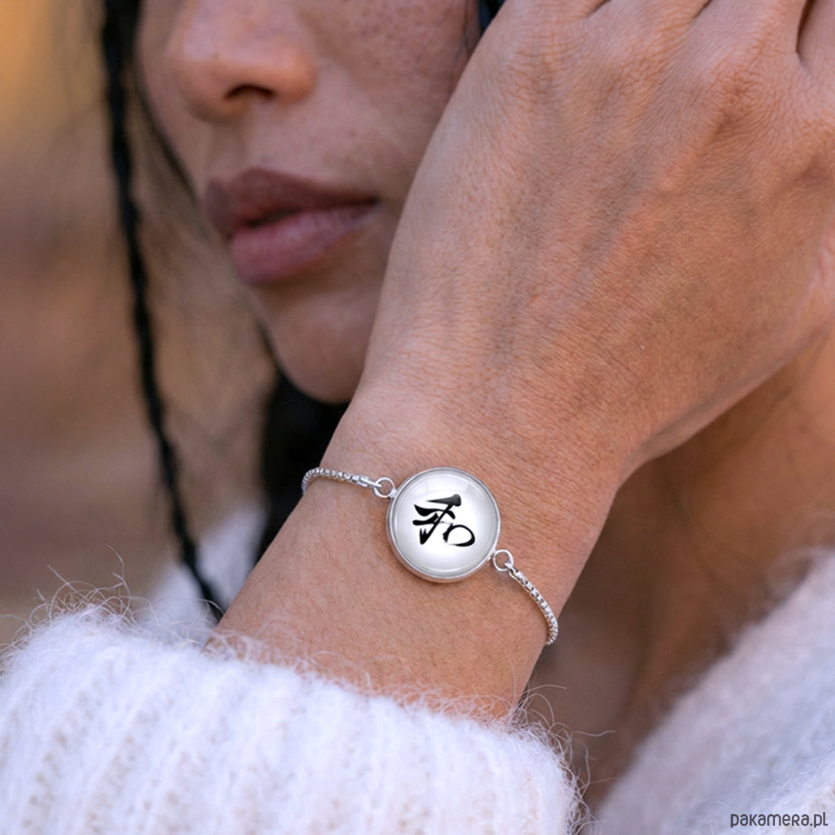 Piękna, delikatna i kobieca bransoletka, w której minimalizm łączy się z symboliką. Pod wypukłym, szklanym szkiełkiem ukryta została autorska grafika z japońską kaligrafią słowa „nagomi”, oznaczającego harmonię, ukojenie i wewnętrzny spokój.