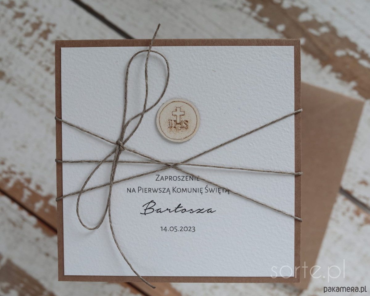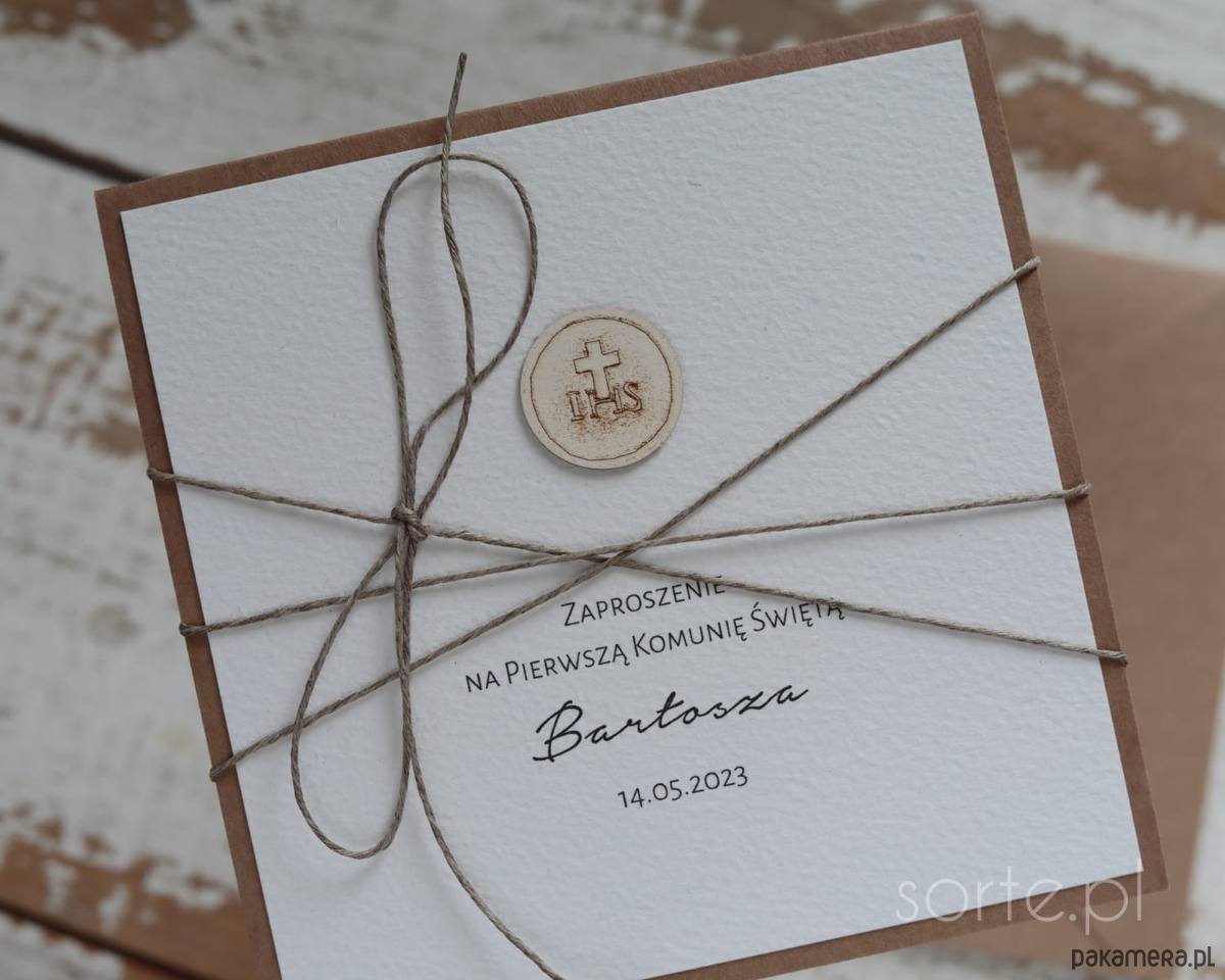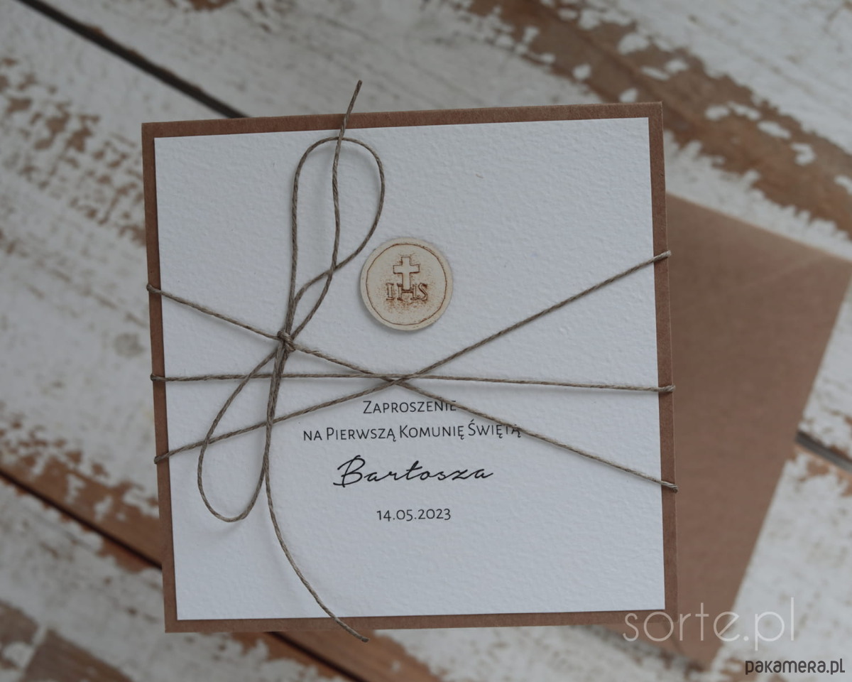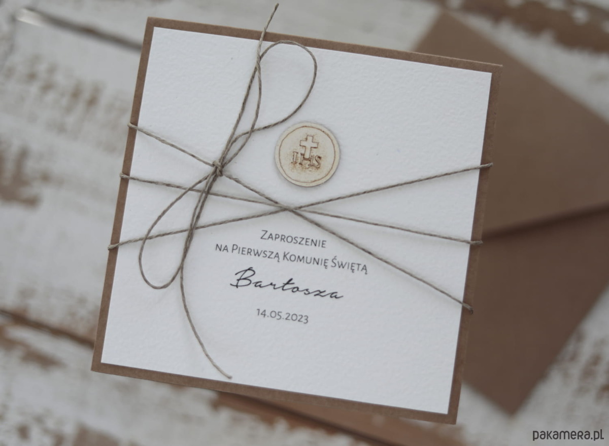 Rustykalne, proste a jednocześnie wymowne, wykonane z materiałów premium zaproszenia komunijne o wymiarach 14x14 cm.