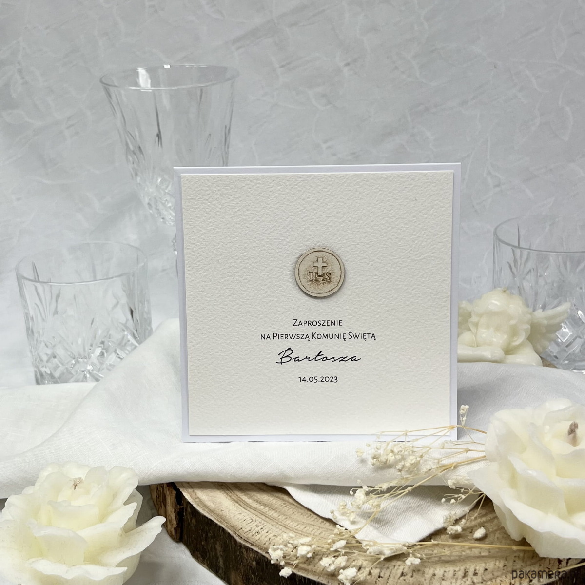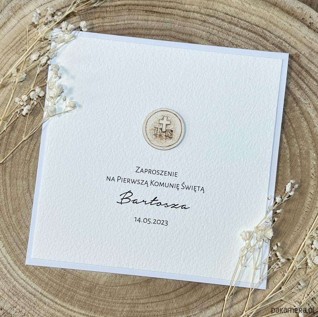 Rustykalne, proste a jednocześnie wymowne, wykonane z materiałów premium zaproszenia komunijne o wymiarach 14x14 cm.