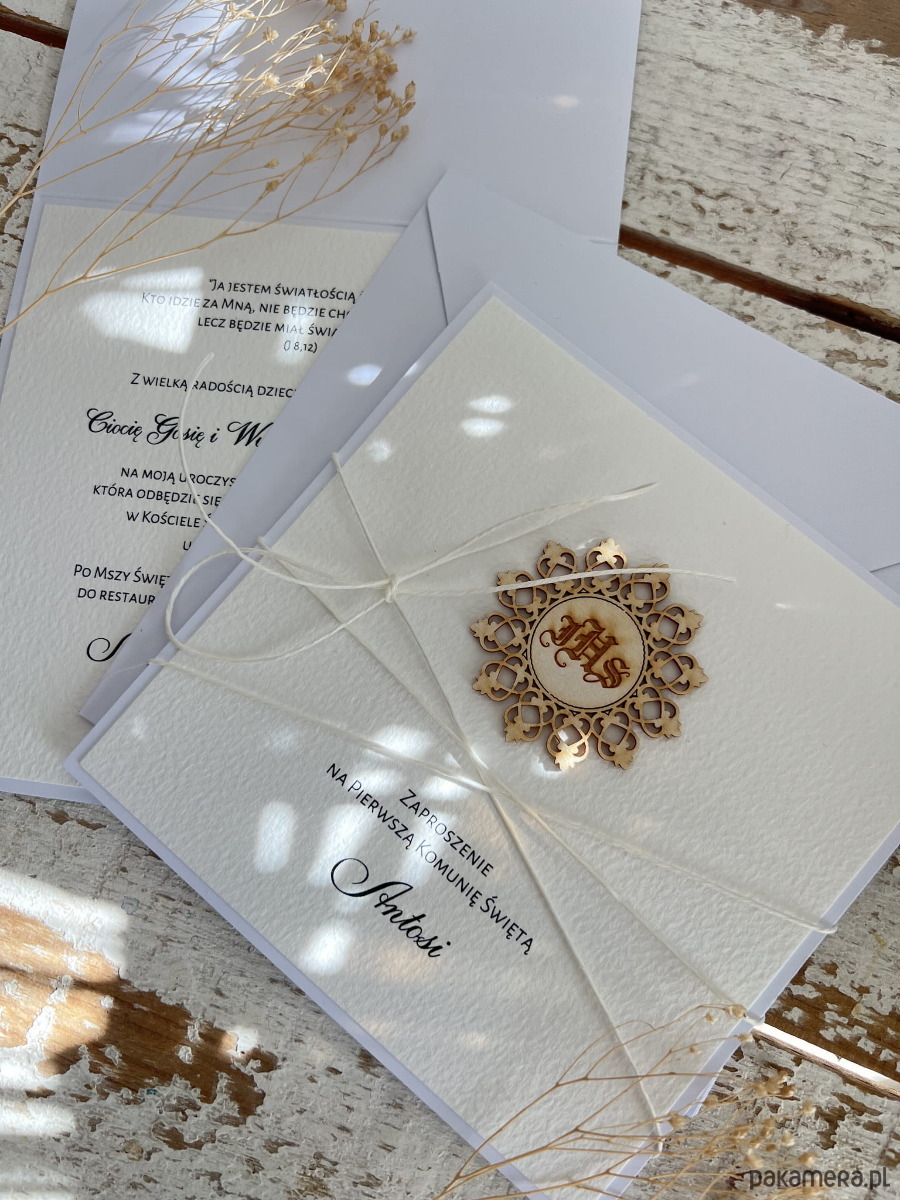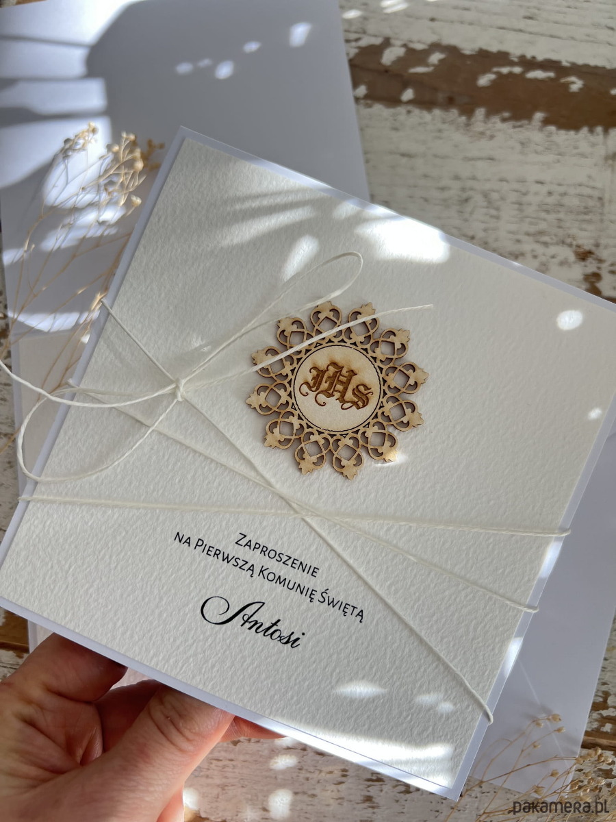 Personalizowane zaproszenie komunijne ręcznie robione wykonane jest na bazie papieru białego z użyciem starannie wyselekcjonowanego papieru bawełnianego w kolorze śmietanki oraz tekturkową ozdobą. Kartka przewiązana jest lnianym sznureczkiem.