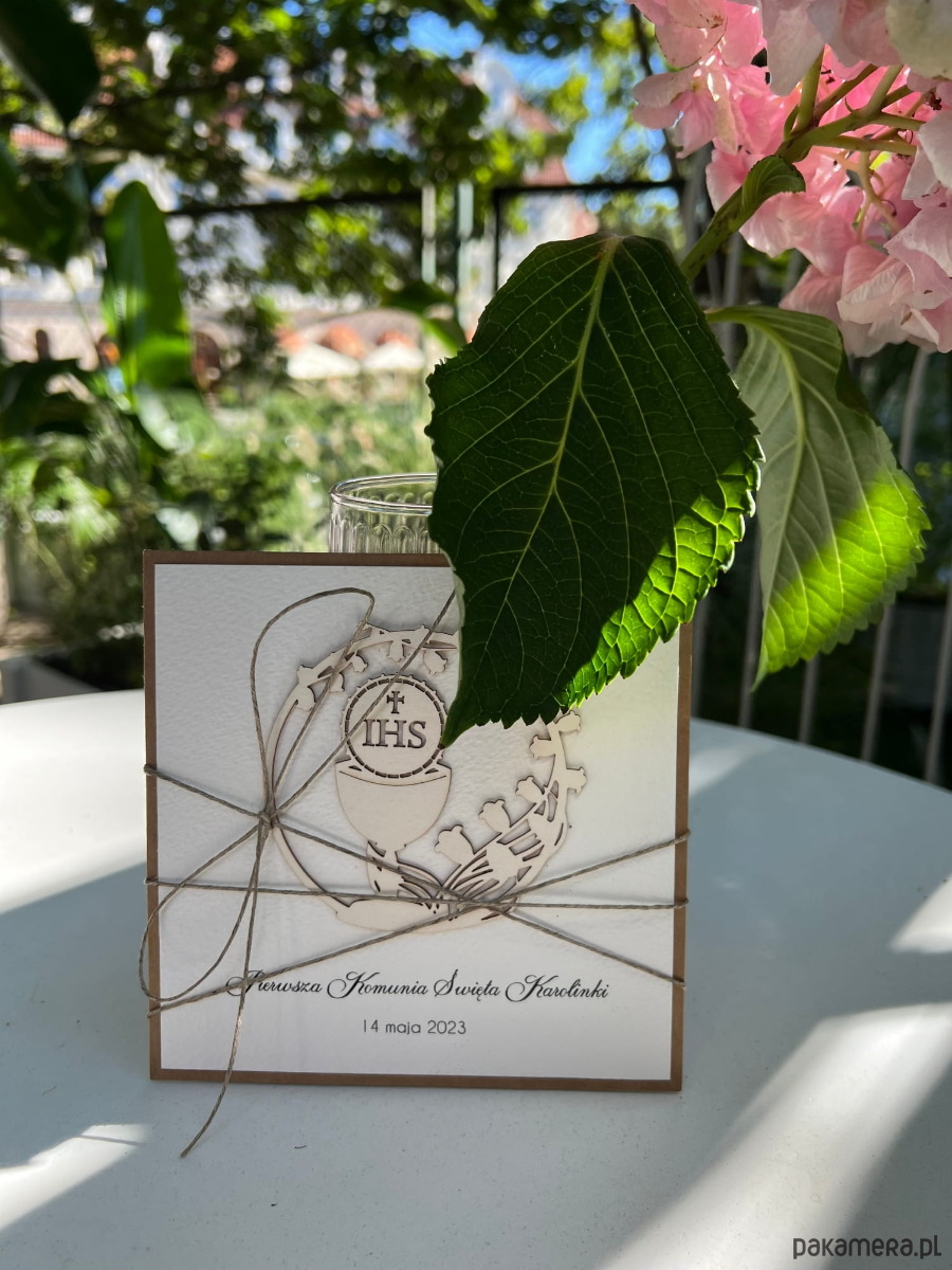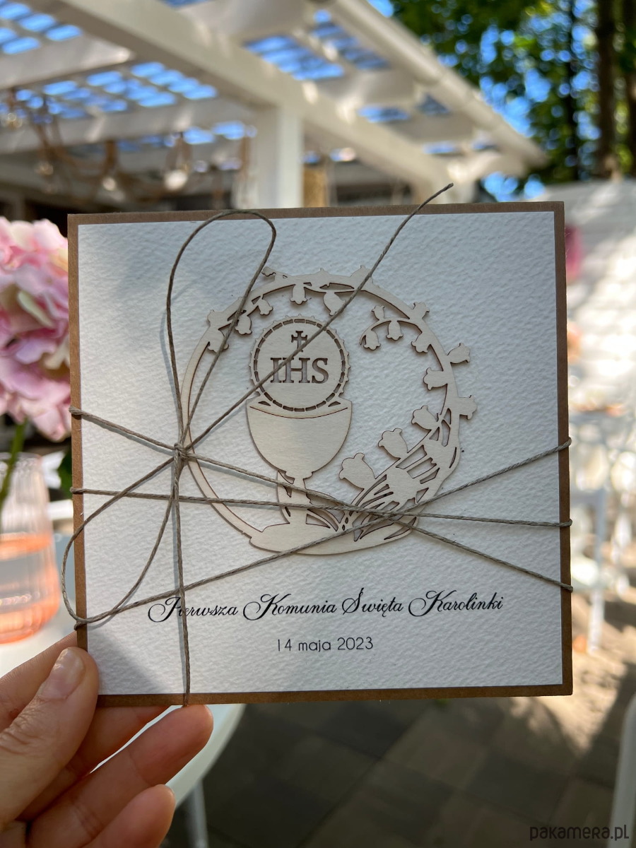 Personalizowane zaproszenie komunijne ręcznie robione wykonane jest na bazie papieru kraftowego z użyciem starannie wyselekcjonowanego papieru bawełnianego w kolorze śmietanki z nadrukiem oraz tekturkową ozdobą. Kartka przewiązana jest lnianym sznureczkiem.