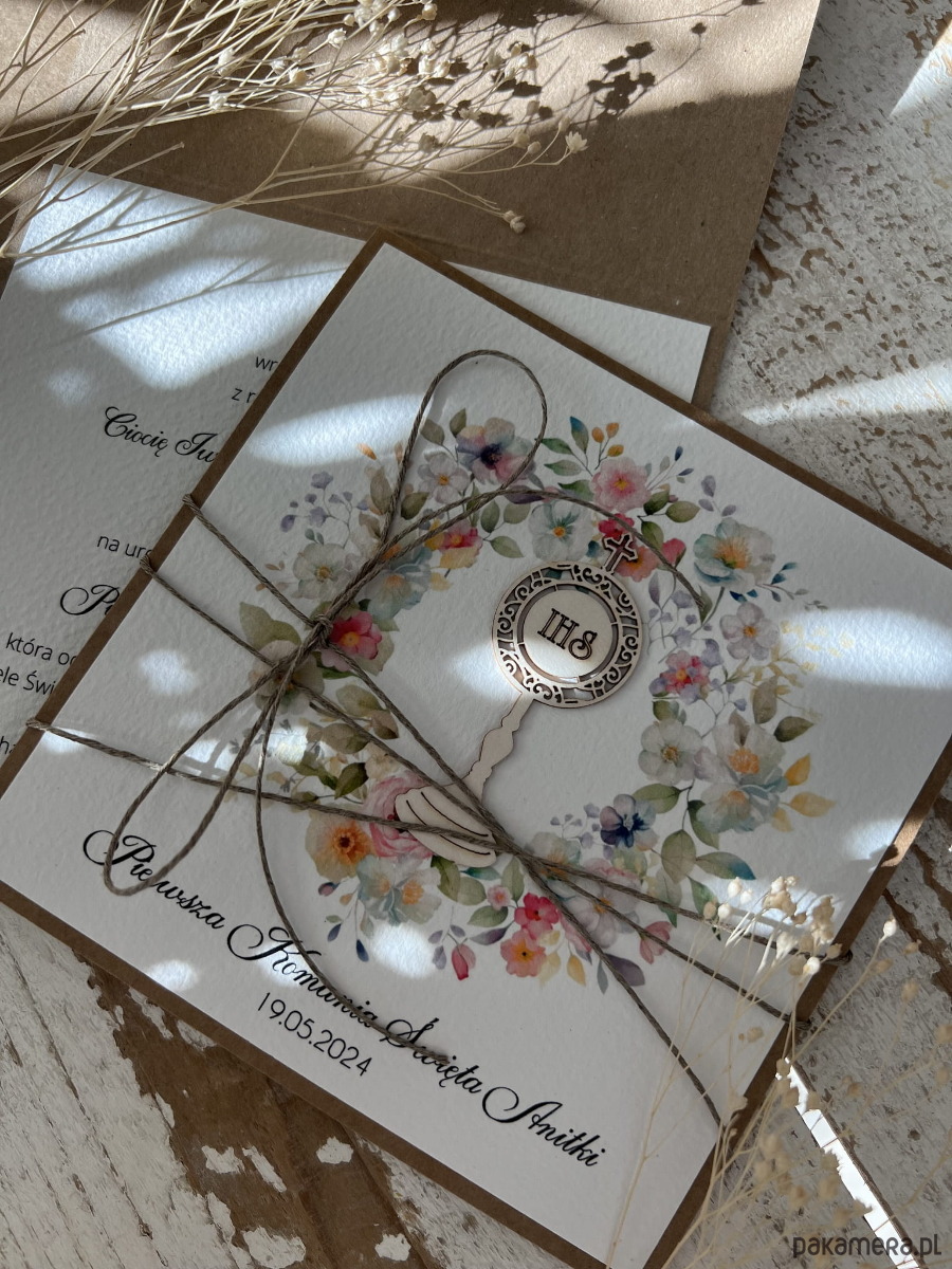 Personalizowane zaproszenie komunijne ręcznie robione wykonane jest na bazie papieru kraftowego z użyciem starannie wyselekcjonowanego papieru bawełnianego w kolorze śmietanki z nadrukiem oraz tekturkową ozdobą. Kartka przewiązana jest lnianym sznureczkiem.