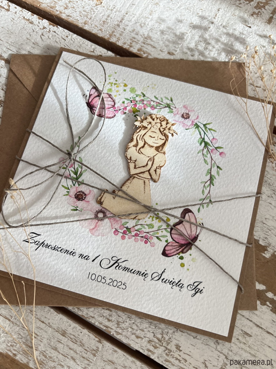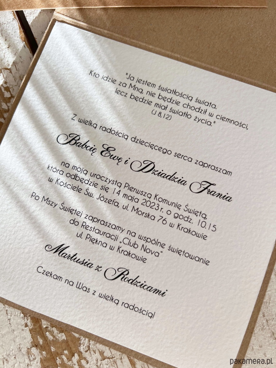 Personalizowane zaproszenie komunijne ręcznie robione wykonane jest na bazie papieru kraftowego z użyciem starannie wyselekcjonowanego papieru bawełnianego w kolorze śmietanki z nadrukiem oraz tekturkową ozdobą. Kartka przewiązana jest lnianym sznureczkiem.