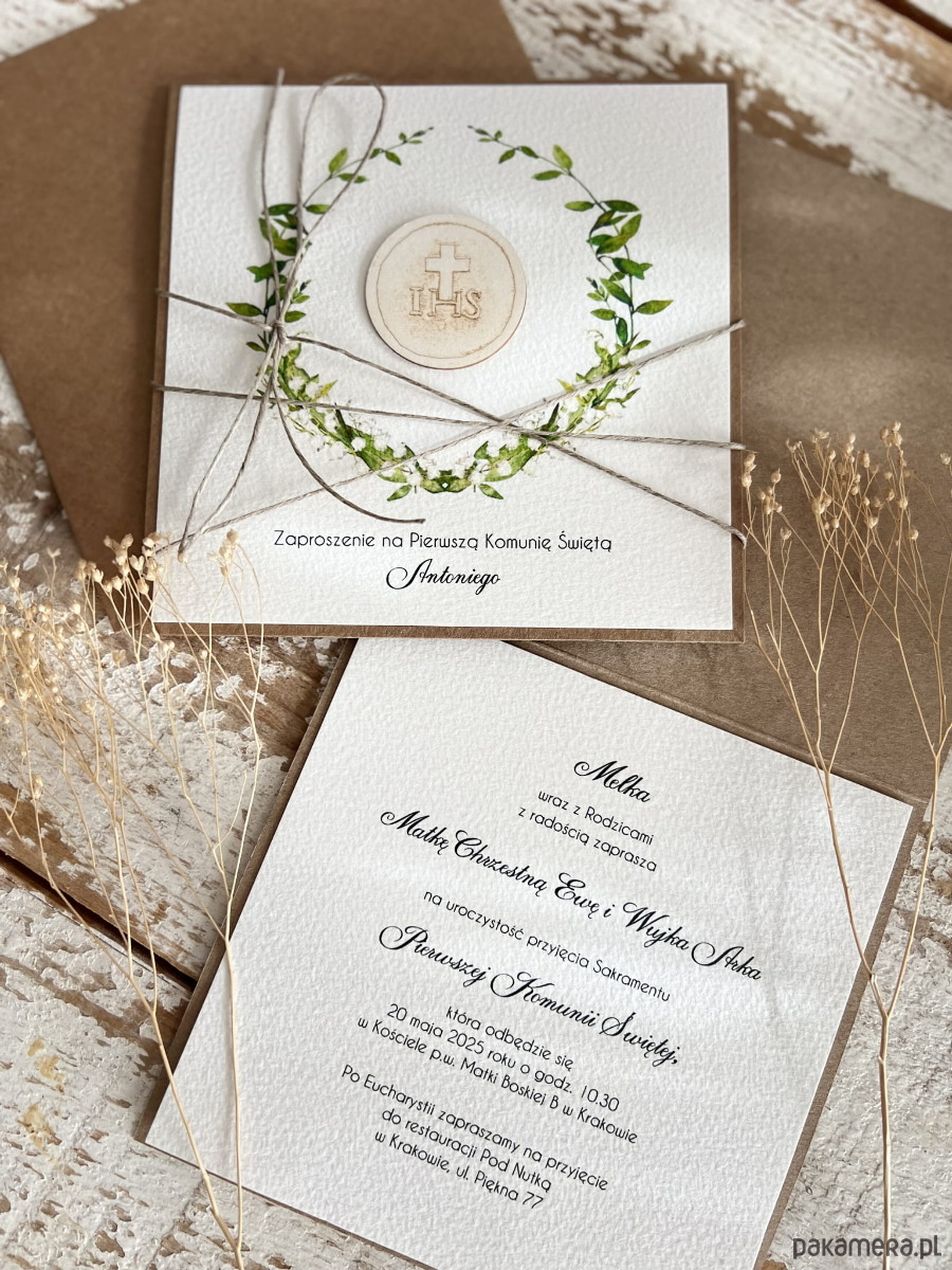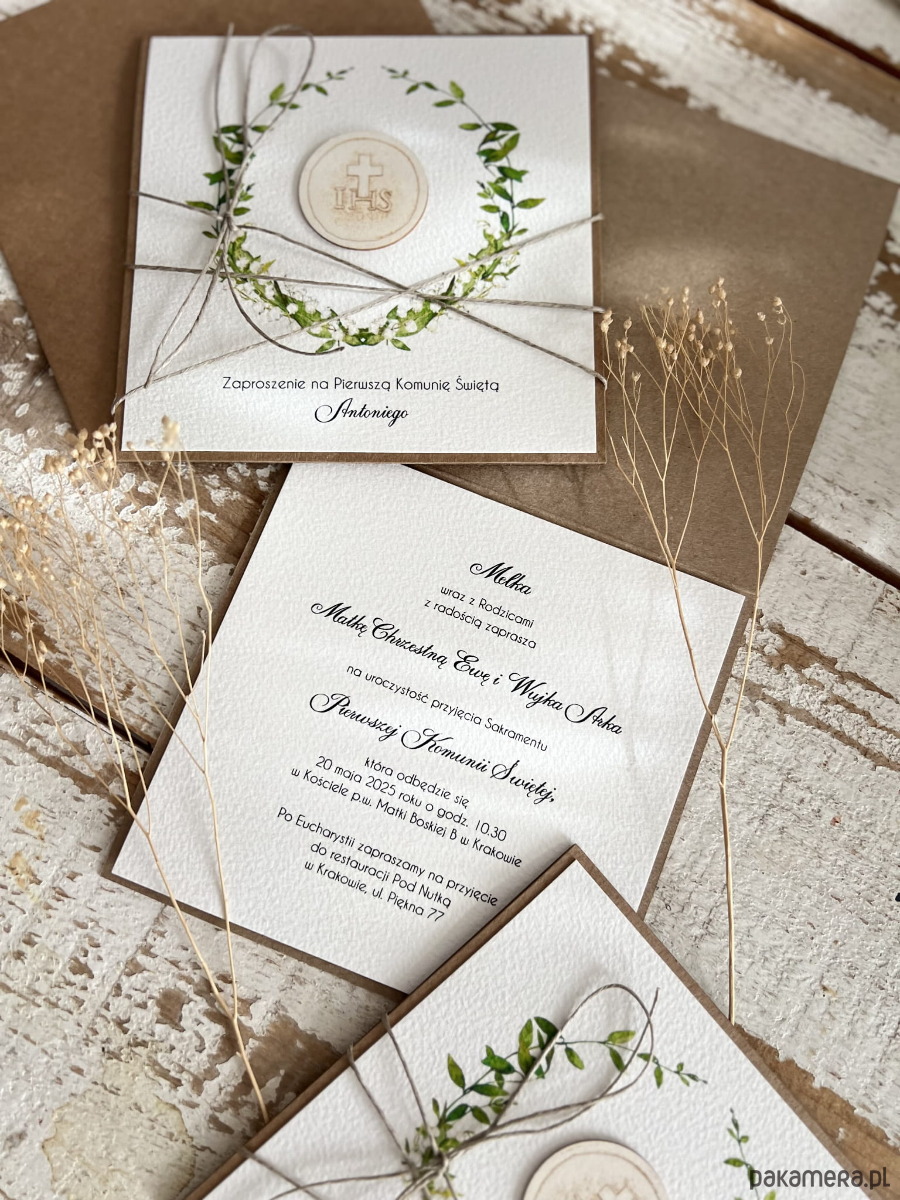 Personalizowane zaproszenie komunijne ręcznie robione wykonane jest na bazie papieru kraftowego z użyciem starannie wyselekcjonowanego papieru bawełnianego w kolorze śmietanki z nadrukiem oraz tekturkową ozdobą. Kartka przewiązana jest lnianym sznureczkiem.