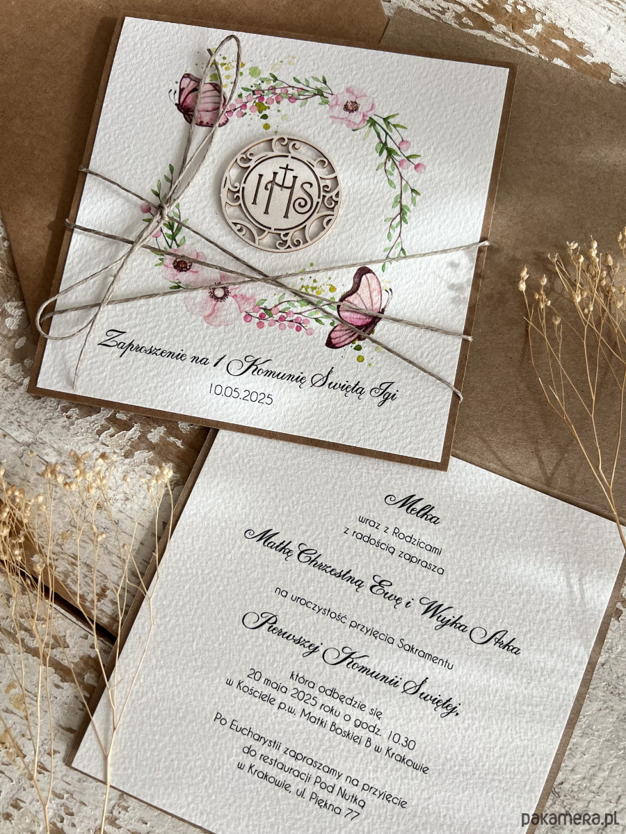 Personalizowane zaproszenie komunijne ręcznie robione wykonane jest na bazie papieru kraftowego z użyciem starannie wyselekcjonowanego papieru bawełnianego w kolorze śmietanki z nadrukiem oraz tekturkową ozdobą. Kartka przewiązana jest lnianym sznureczkiem.