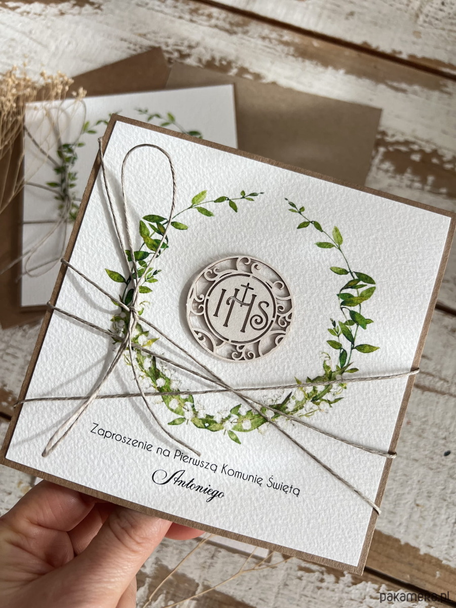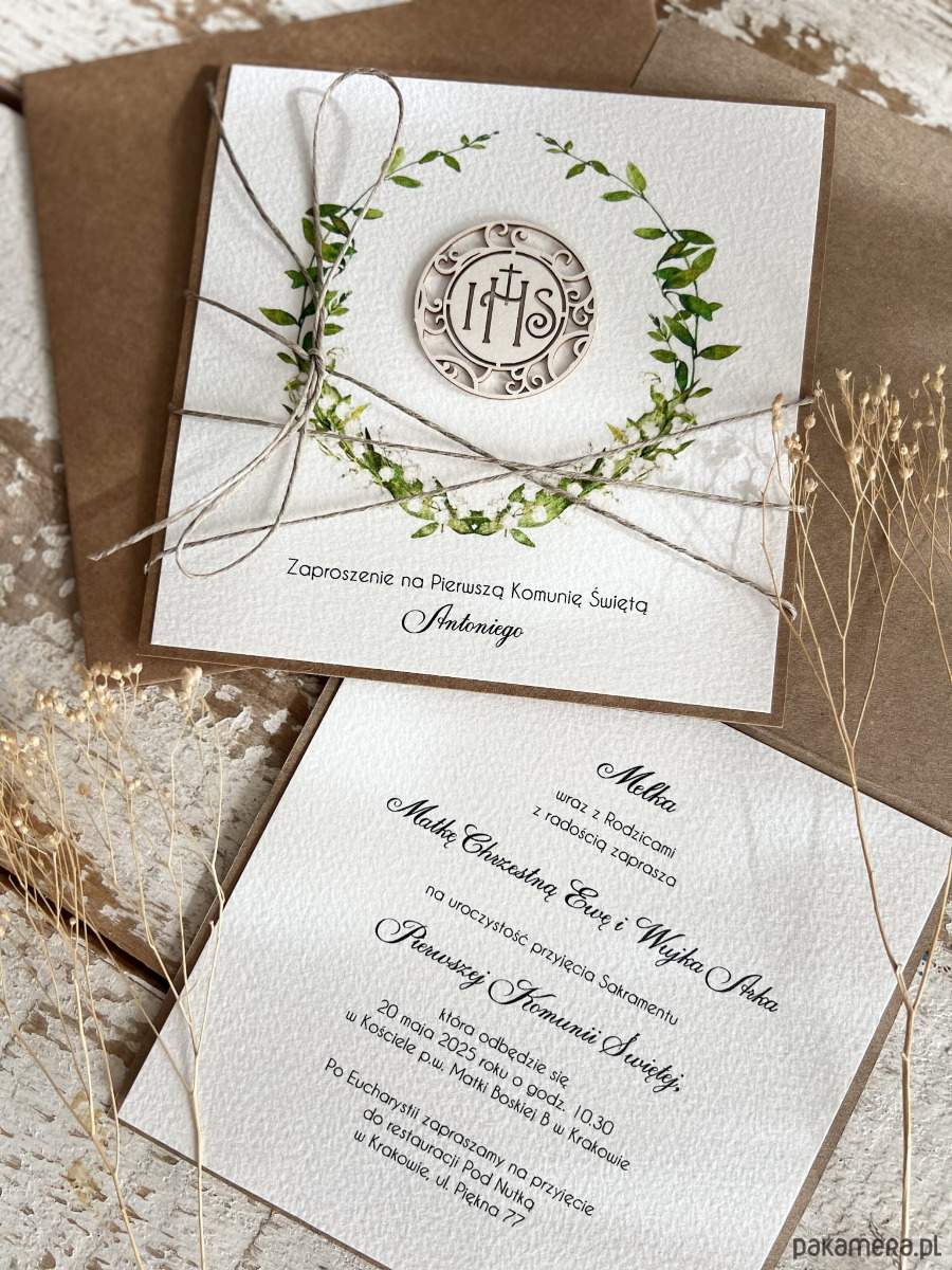 Personalizowane zaproszenie komunijne ręcznie robione wykonane jest na bazie papieru kraftowego z użyciem starannie wyselekcjonowanego papieru bawełnianego w kolorze śmietanki z nadrukiem oraz tekturkową ozdobą. Kartka przewiązana jest lnianym sznureczkiem.
