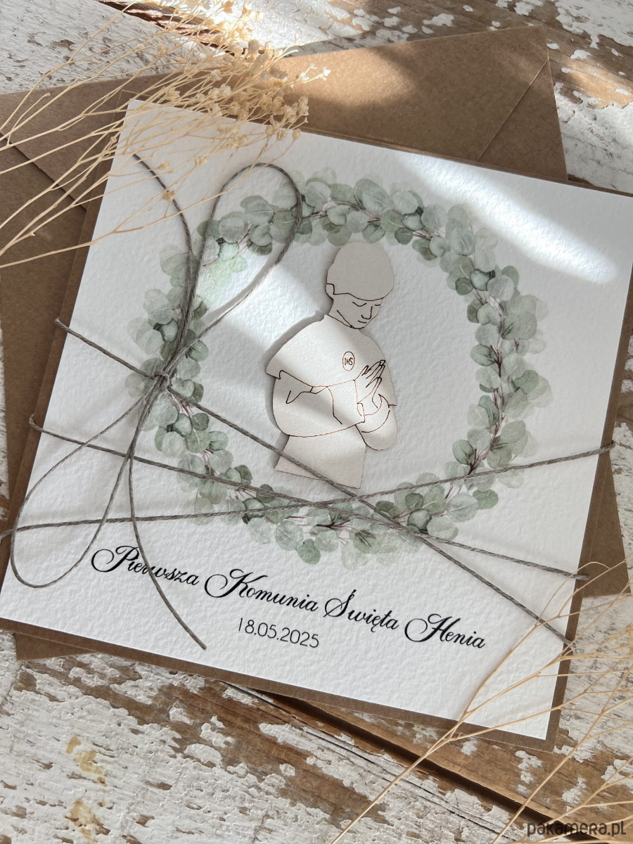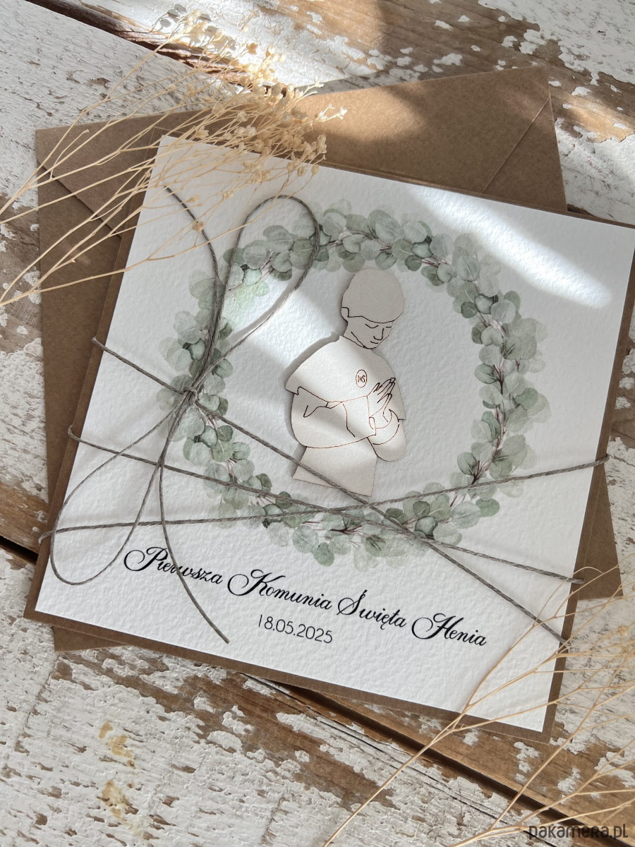 Personalizowane zaproszenie komunijne ręcznie robione wykonane jest na bazie papieru kraftowego z użyciem starannie wyselekcjonowanego papieru bawełnianego w kolorze śmietanki z nadrukiem oraz tekturkową ozdobą. Kartka przewiązana jest lnianym sznureczkiem.