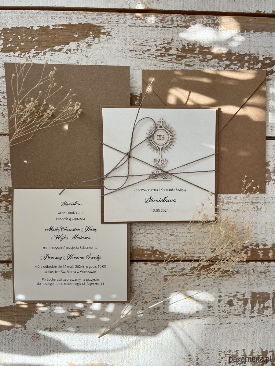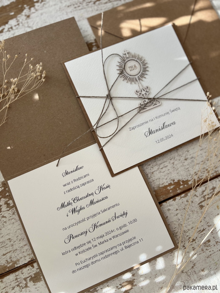 Personalizowane zaproszenie komunijne ręcznie robione wykonane jest na bazie papieru kraftowego z użyciem starannie wyselekcjonowanego papieru bawełnianego w kolorze śmietanki z nadrukiem oraz tekturkową ozdobą. Kartka przewiązana jest lnianym sznureczkiem.