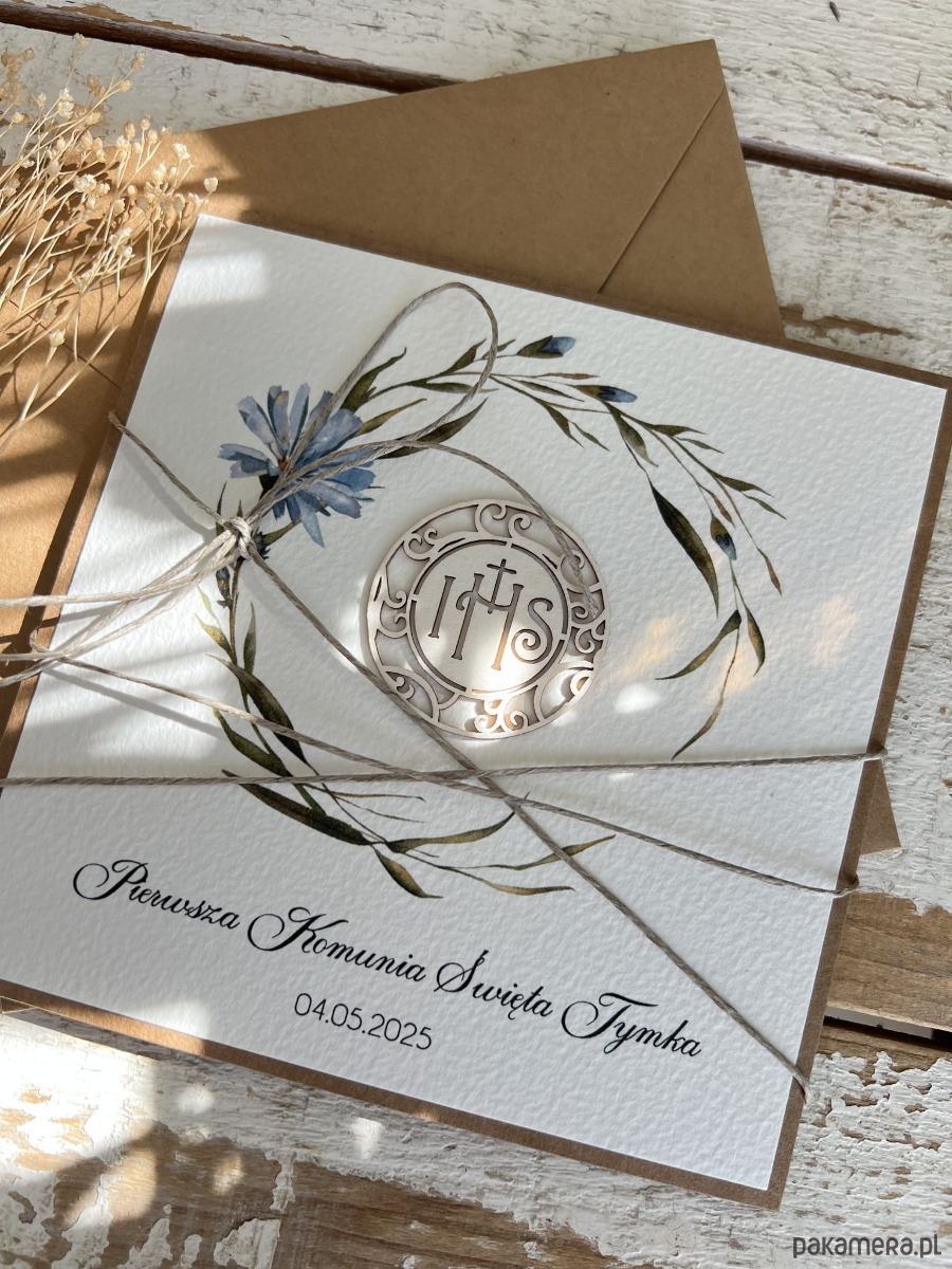 Zaproszenia na komunię o wymiarze 14x14 cm wykonane z papieru kraftowego, papieru białego z fakturą lnu oraz ozdoby tekturkowej.