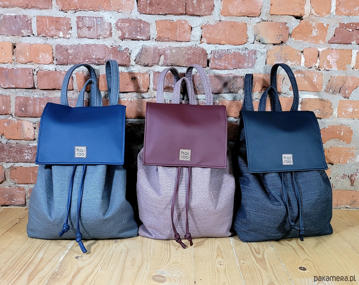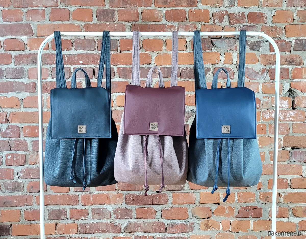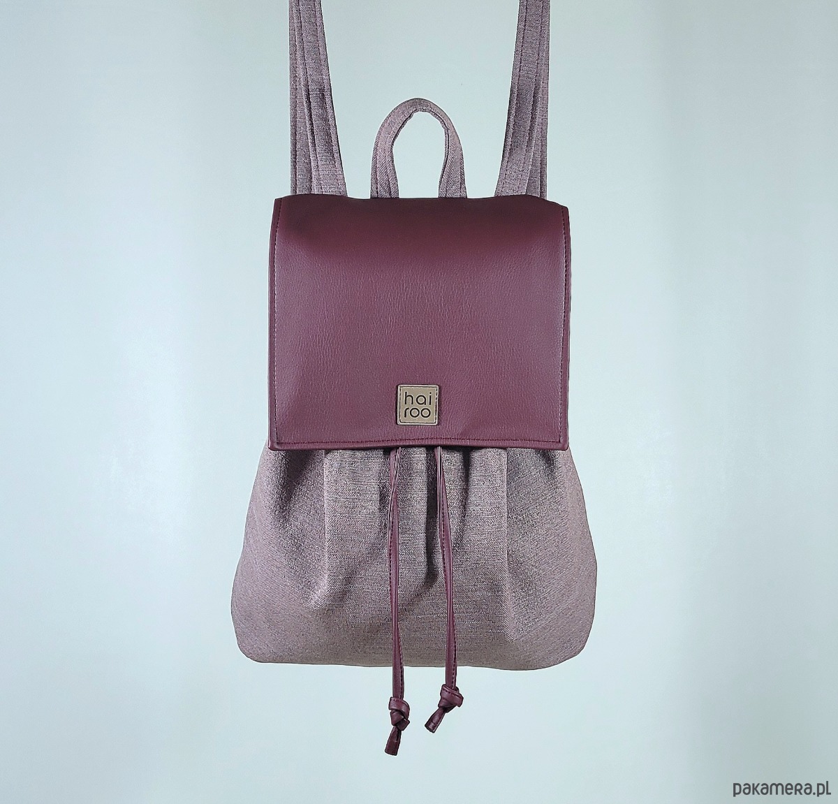 Bazę tworzy pojemna komora, uszyta z poliestru z recyklingu (tkanina z butelek PET). Całość zamyka niewielka klapa uszyta z ekoskóry z zapięciem na magnez i sznurki do ściągania (uszyte z ekoskóry).