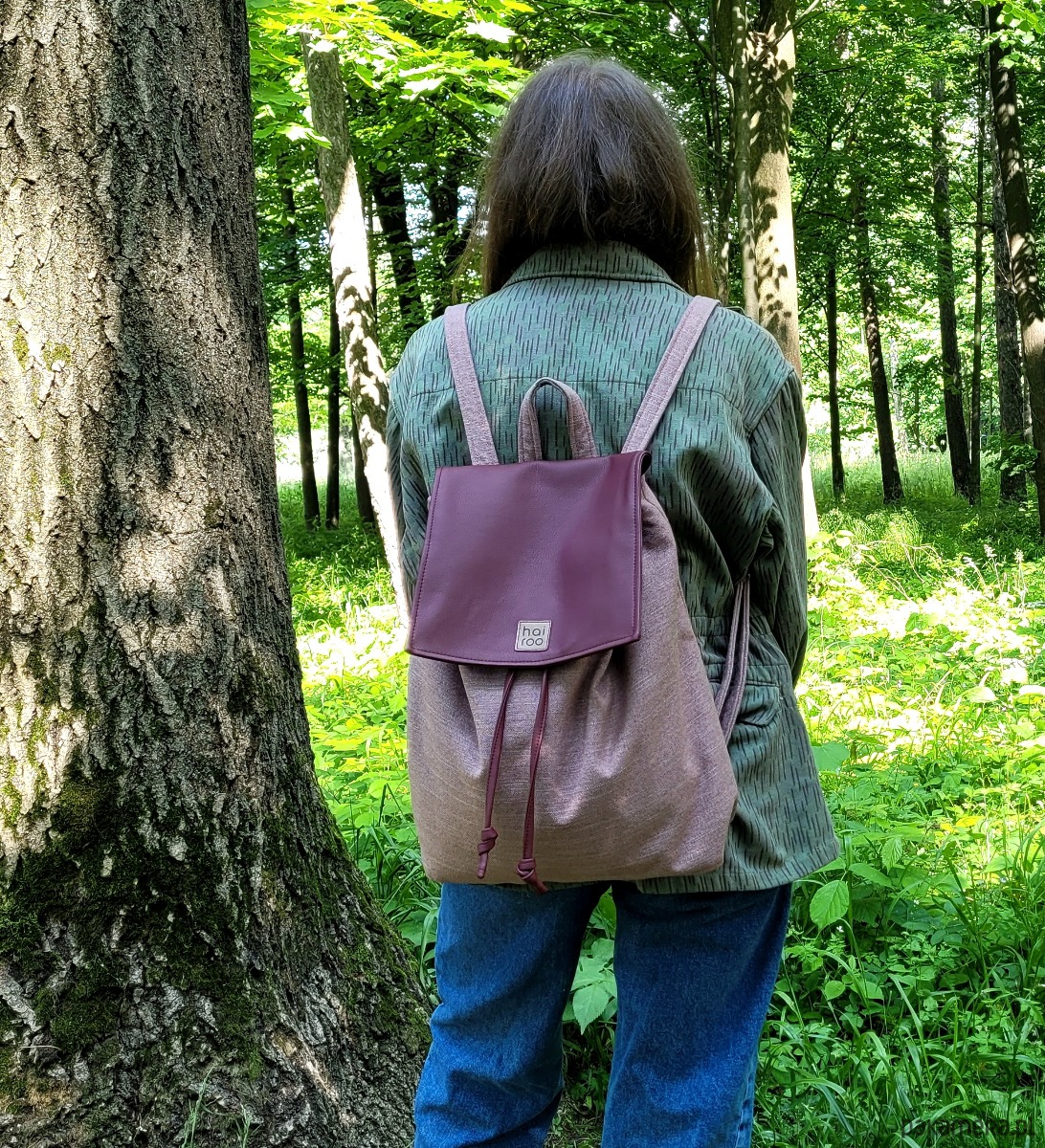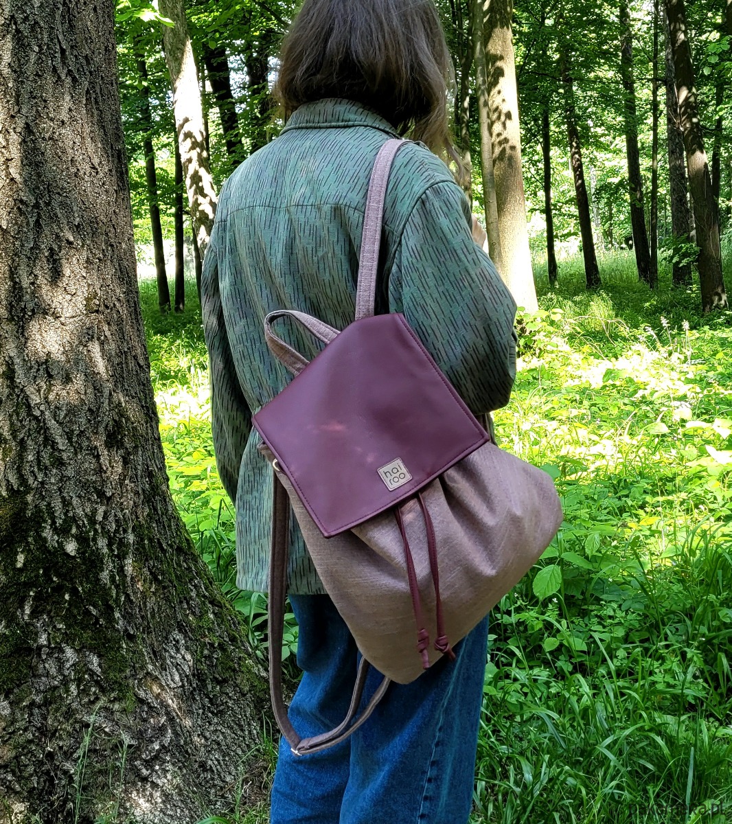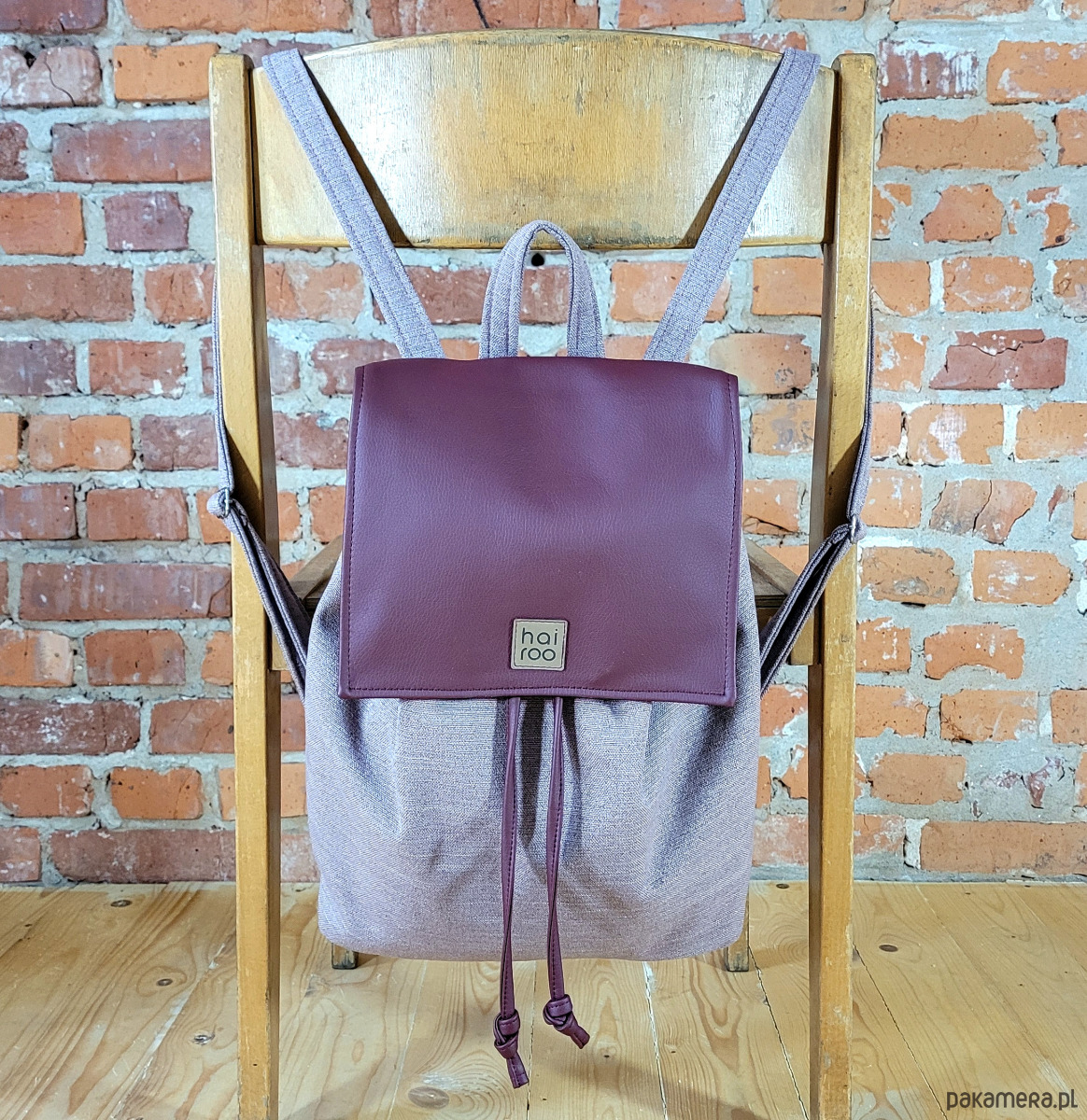 Bazę tworzy pojemna komora, uszyta z poliestru z recyklingu (tkanina z butelek PET). Całość zamyka niewielka klapa uszyta z ekoskóry z zapięciem na magnez i sznurki do ściągania (uszyte z ekoskóry).