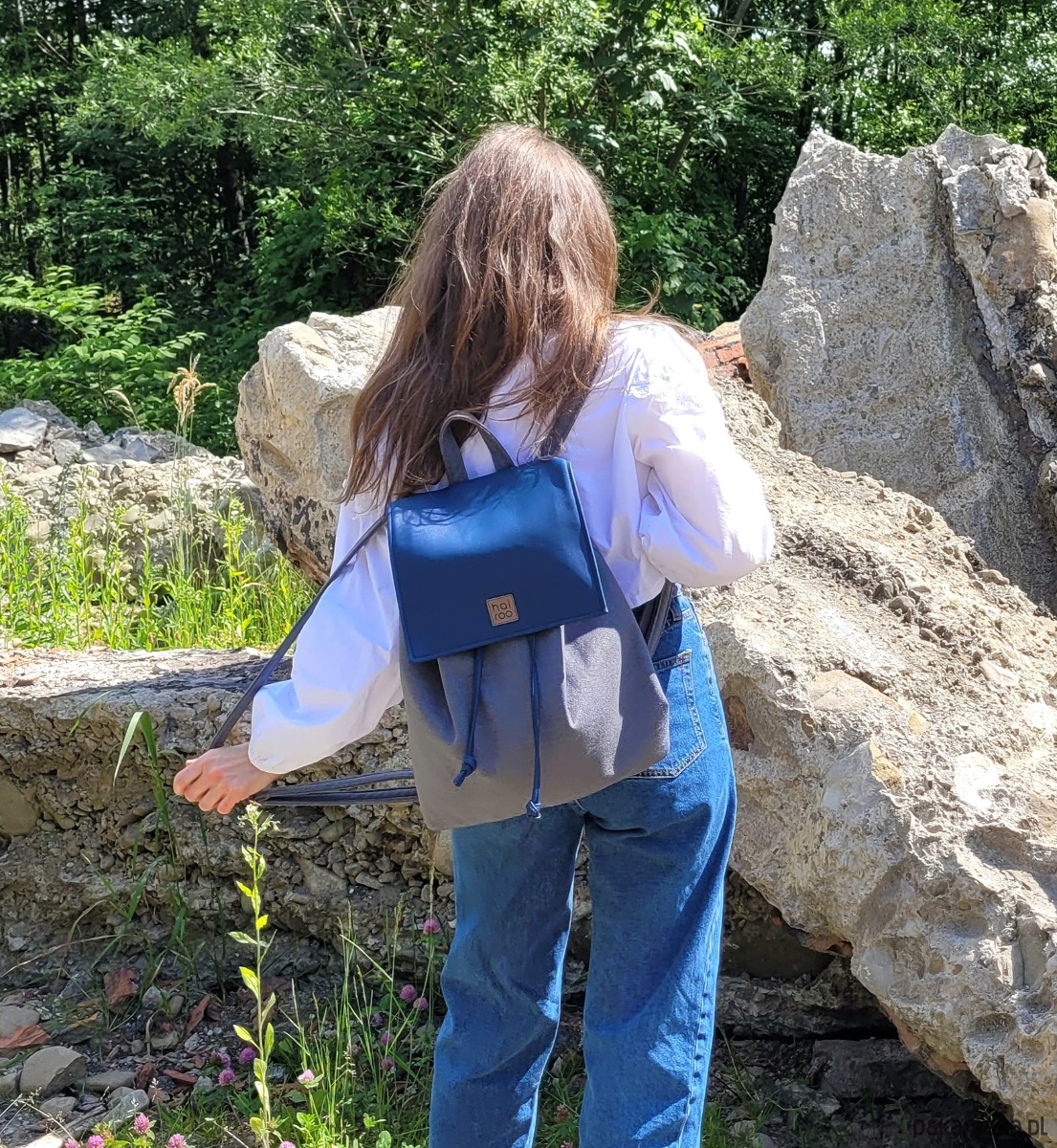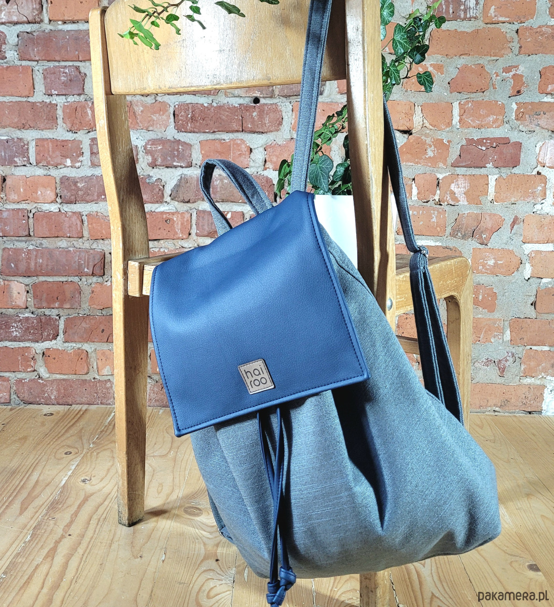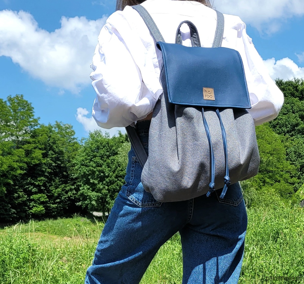 Bazę tworzy pojemna komora, uszyta z poliestru z recyklingu (tkanina z butelek PET). Całość zamyka niewielka klapa uszyta z ekoskóry z zapięciem na magnez i sznurki do ściągania (uszyte z ekoskóry).
