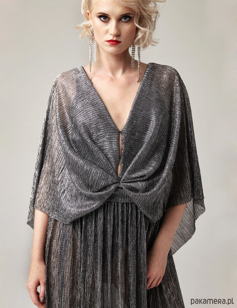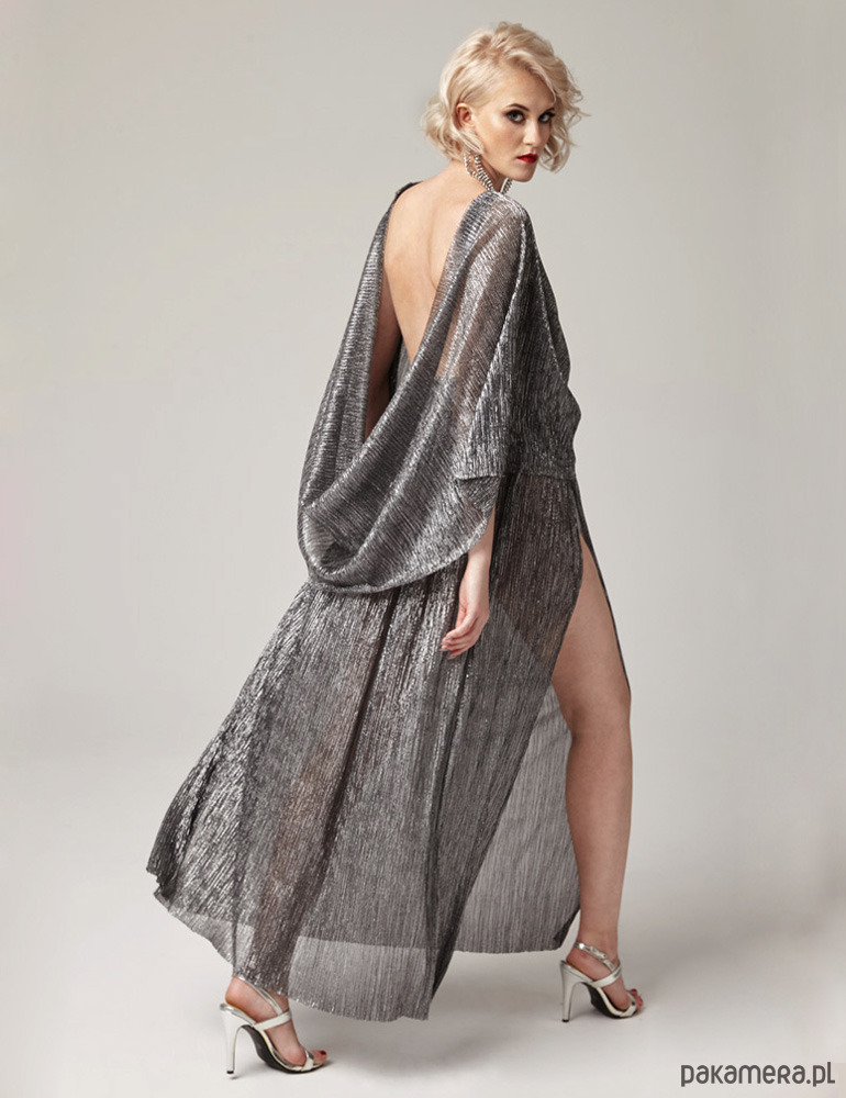 MATERIAŁ: Uszyta z delikatnej dzianiny brokatowej, plisowanej, lejącej się, transparentnej, która pięknie układa się na sylwetce i delikatnie mieni podczas chodzenia.