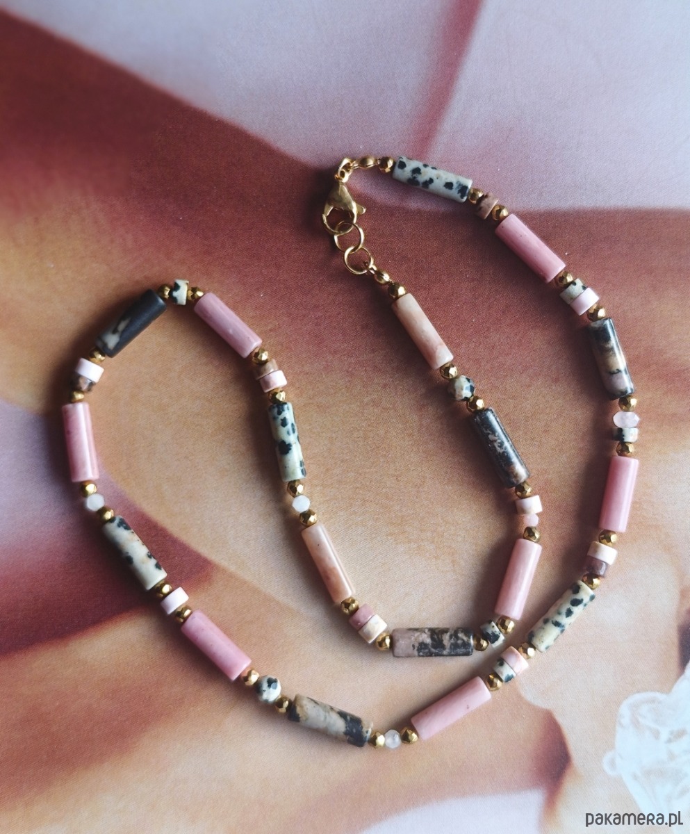 Naszyjnik z naturalnych kamieni na nici jedwabnej i z wykończeniami ze stali chirurgicznej.Dlugość 42cm.