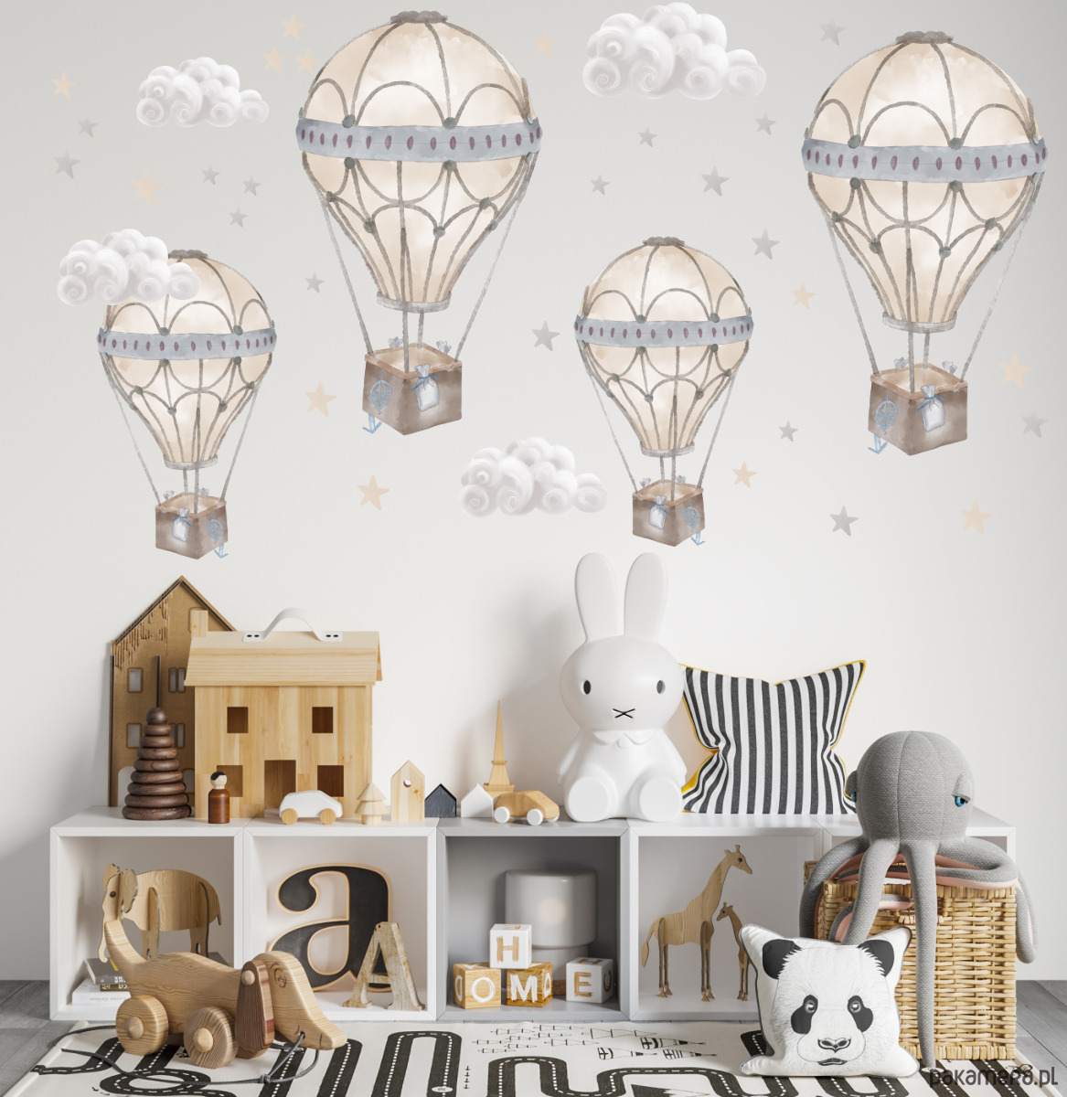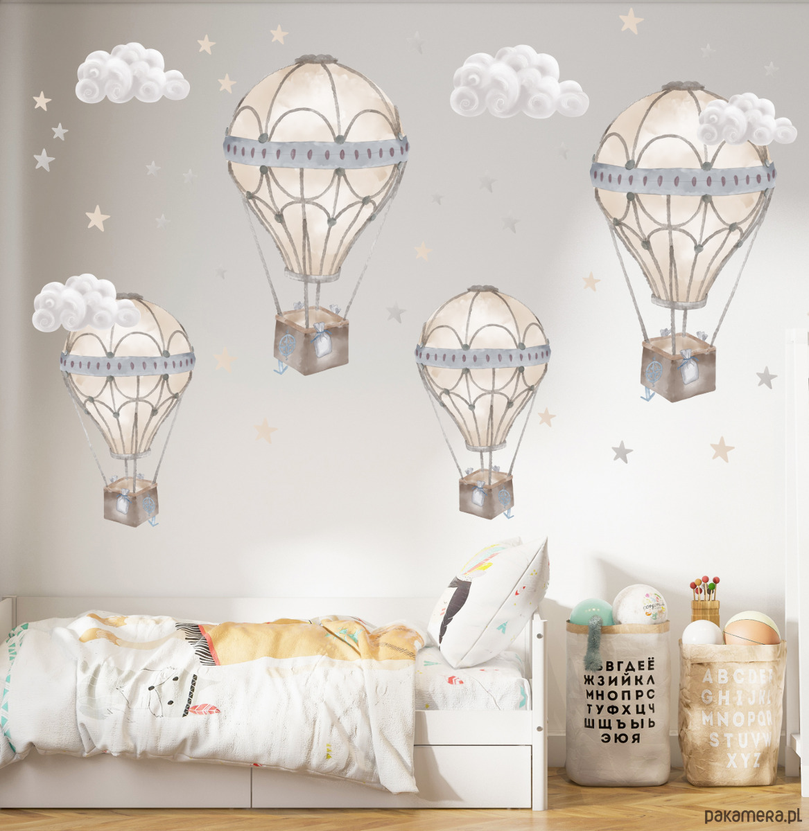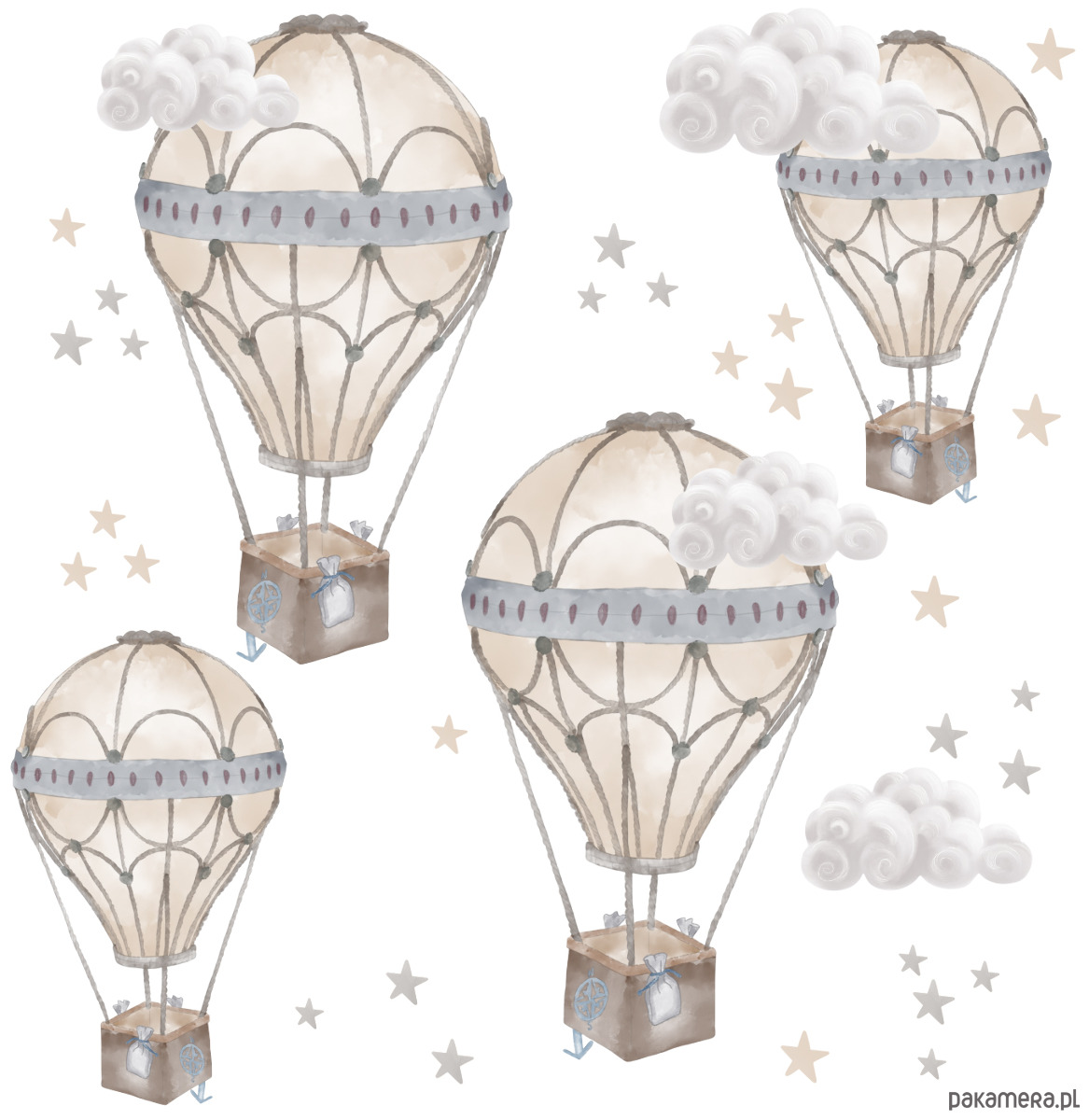 Naklejka na ścianę z motywem beżowych balonów, chmurek i gwiazdek. Elementy wycinane bez tła, do dowolnego rozmieszczenia na ścianie.