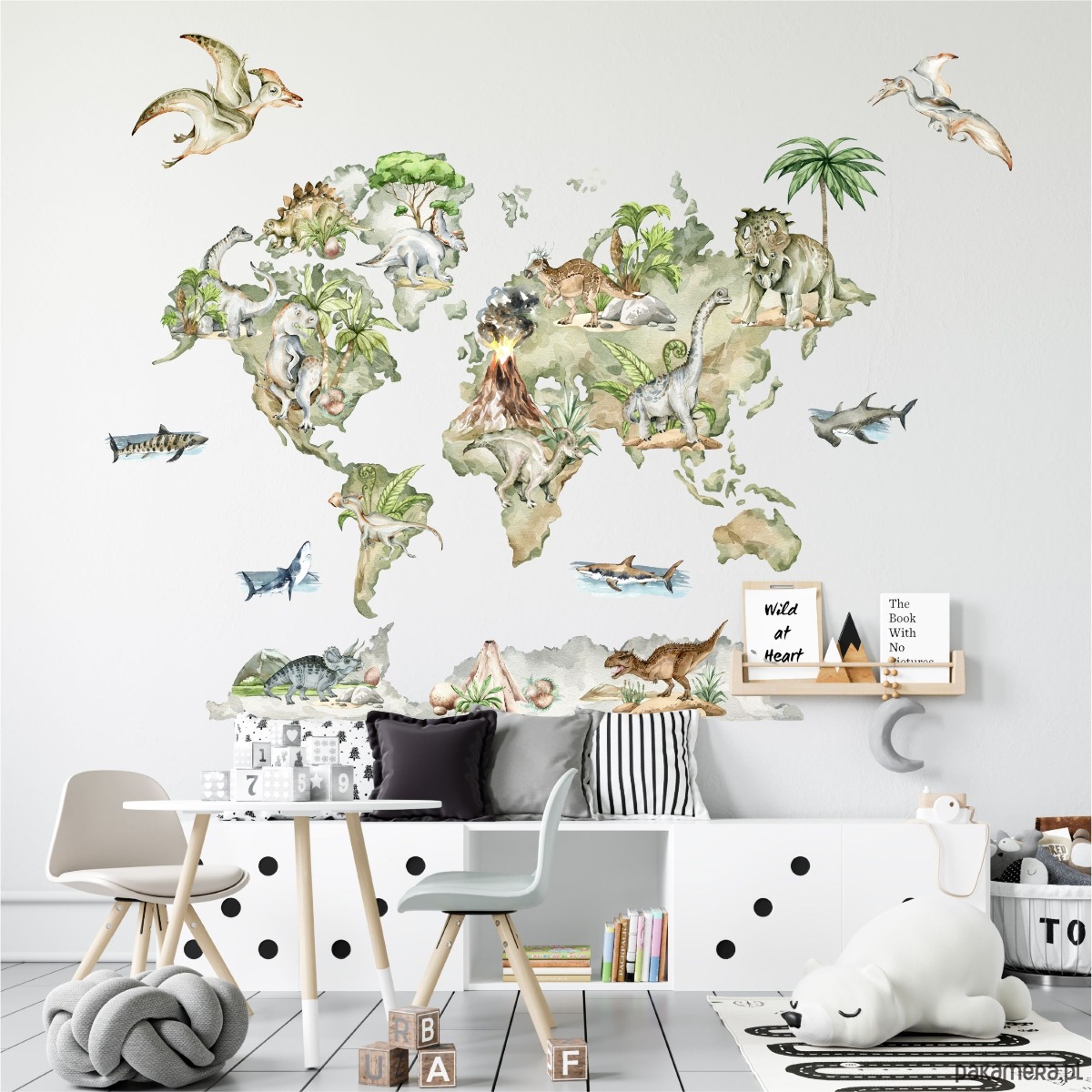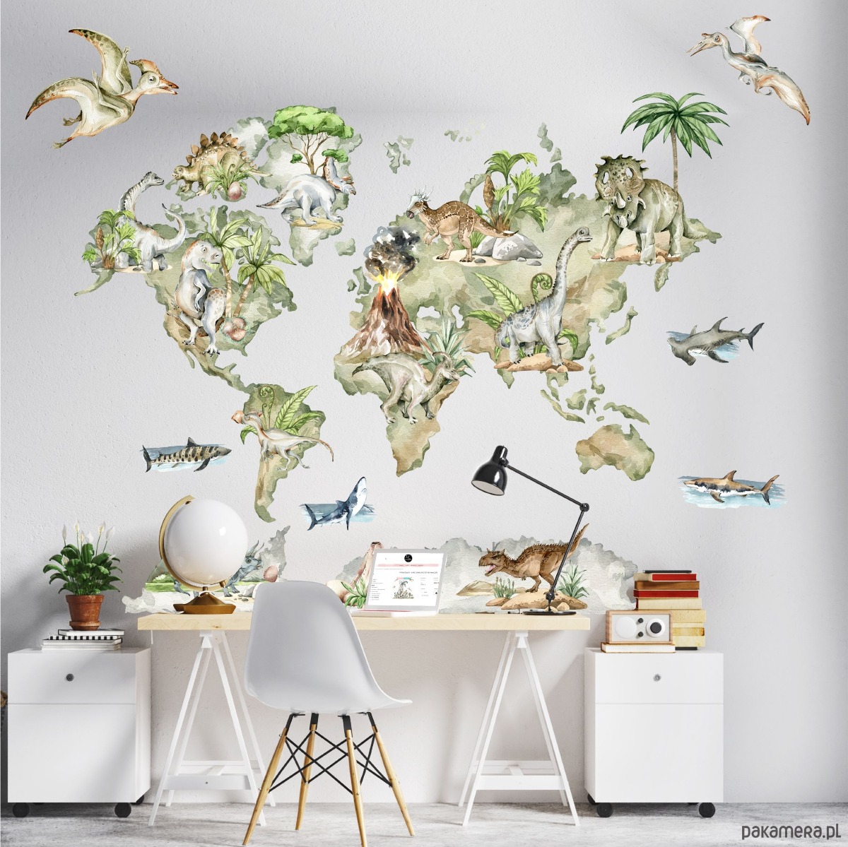 Naklejka przedstawia mapę świata z rozmieszczonymi dinozaurami przypisanymi do kontynentów. Elementy tworzą spójną, ilustracyjną całość, która łączy funkcję dekoracyjną z poznawczą i pozwala dziecku naturalnie oswajać pojęcia związane z geografią oraz światem prehistorii poprzez codzienną obserwację.