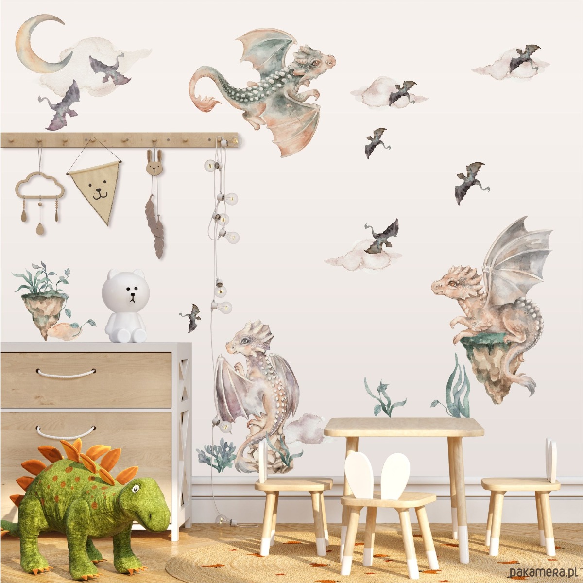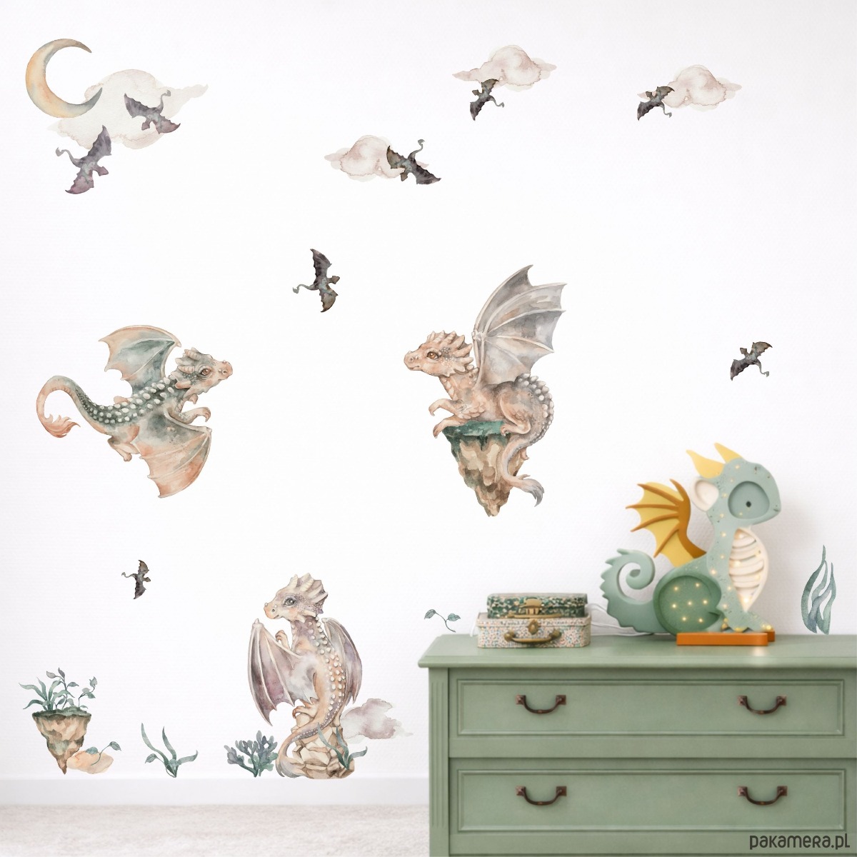 Zestaw akwarelowych naklejek na ścianę z motywem smoków. Naklejki są wycinane po obrysie, bez tła, i wyglądają jak namalowane bezpośrednio na ścianie. Składają się z wielu oddzielnych elementów do samodzielnego rozmieszczenia.